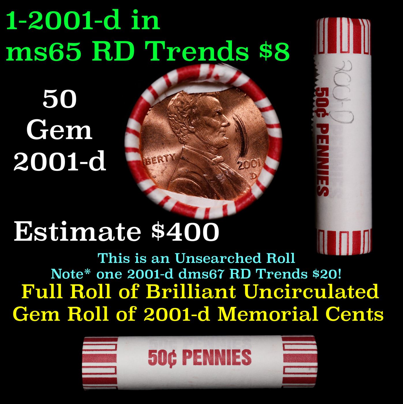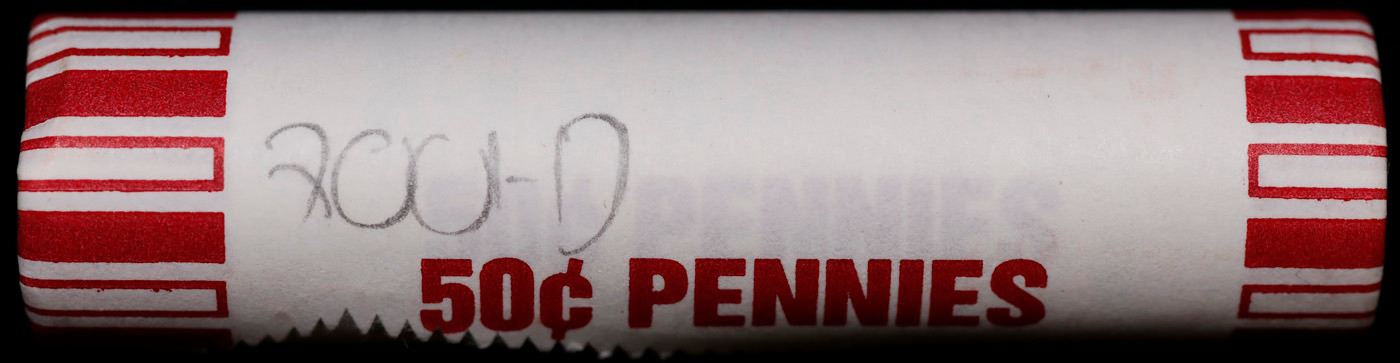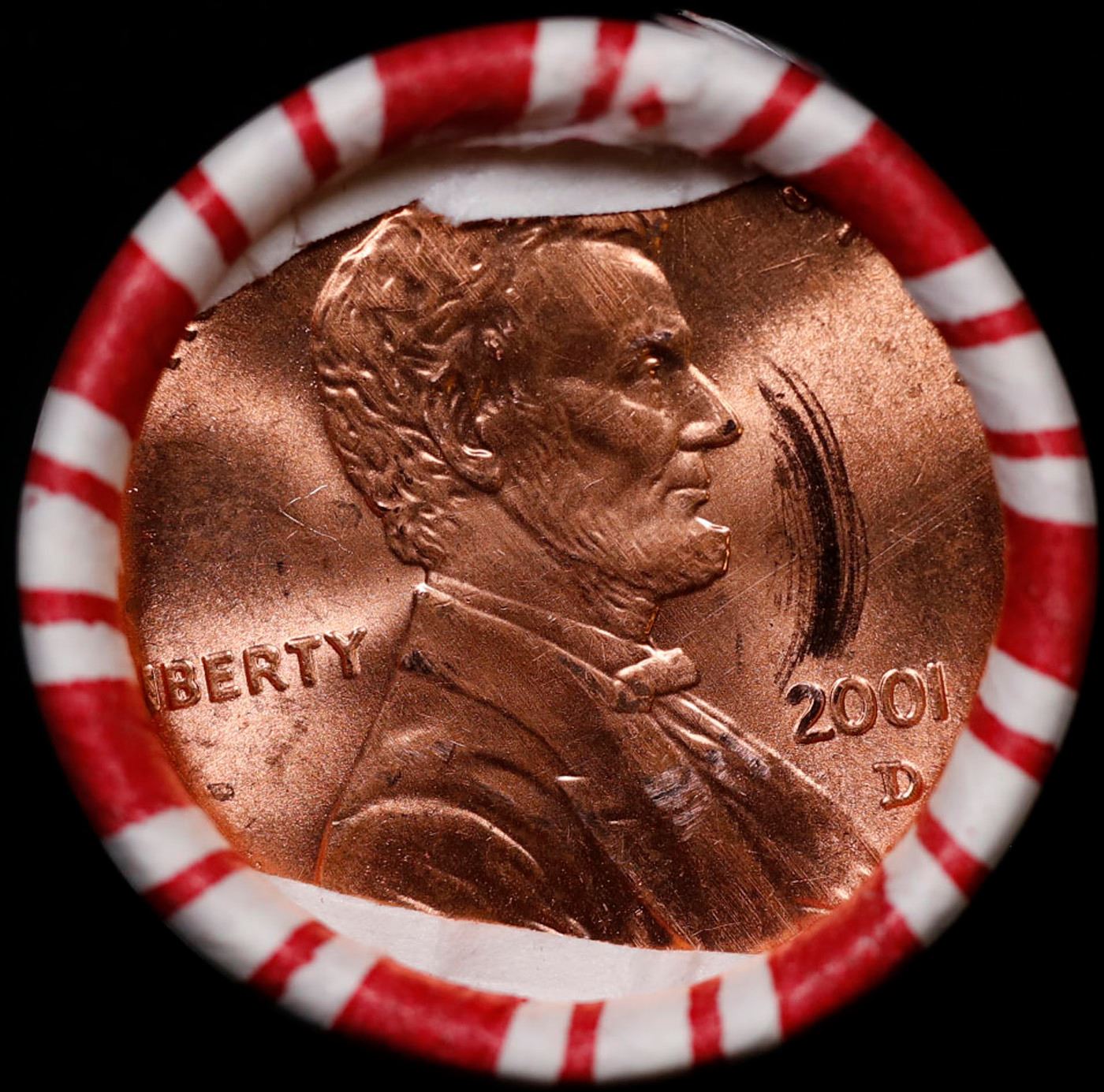 Shotgun Lincoln 1c roll, 2001-d 50 pcs Brandt 50c Wrapper.. A terrific Shotgun roll of Lincoln cents. Most if not all coin should be cherry red.