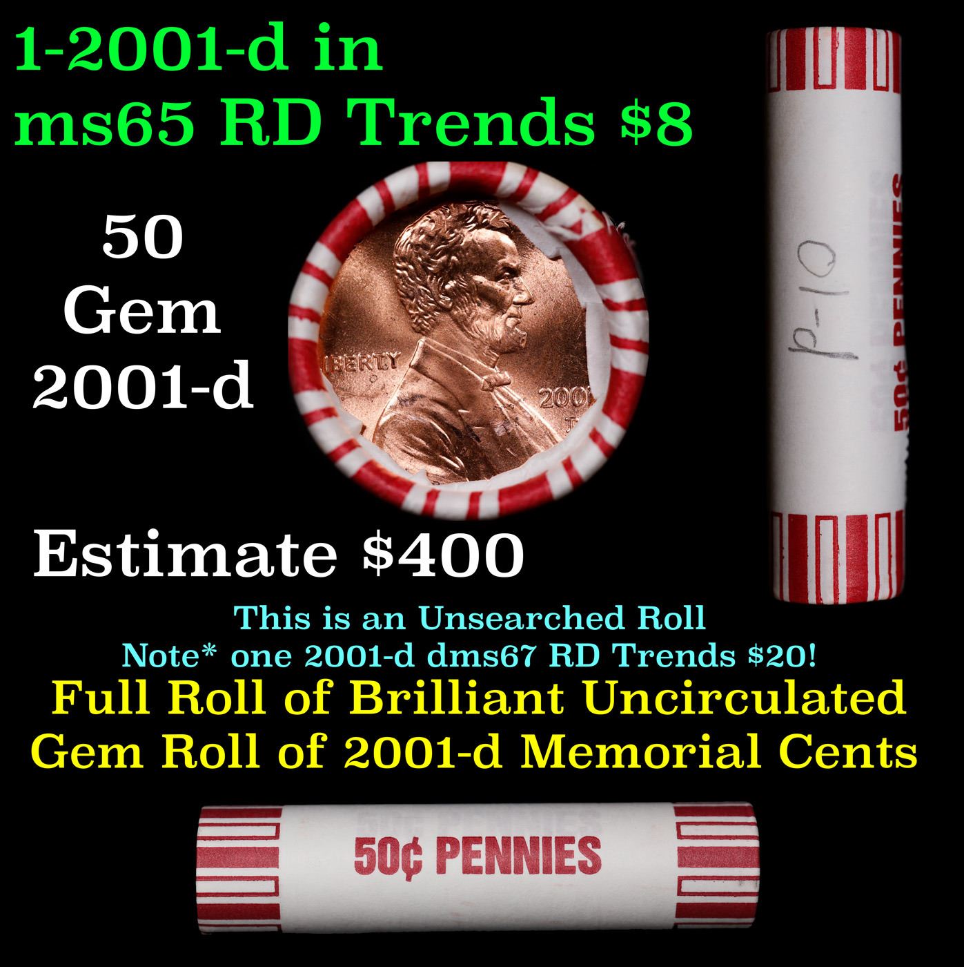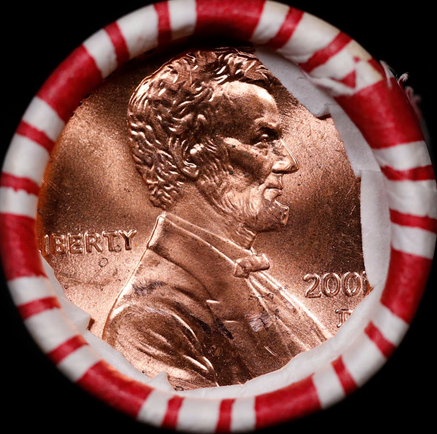 Shotgun Lincoln 1c roll, 2001-d 50 pcs Brandt 50c Wrapper.. A terrific Shotgun roll of Lincoln cents. Most if not all coin should be cherry red.