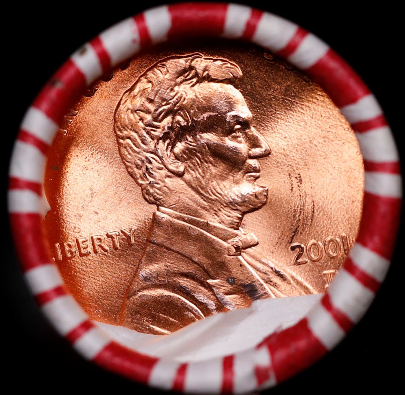 Shotgun Lincoln 1c roll, 2001-d 50 pcs Brandt 50c Wrapper.. A terrific Shotgun roll of Lincoln cents. Most if not all coin should be cherry red.