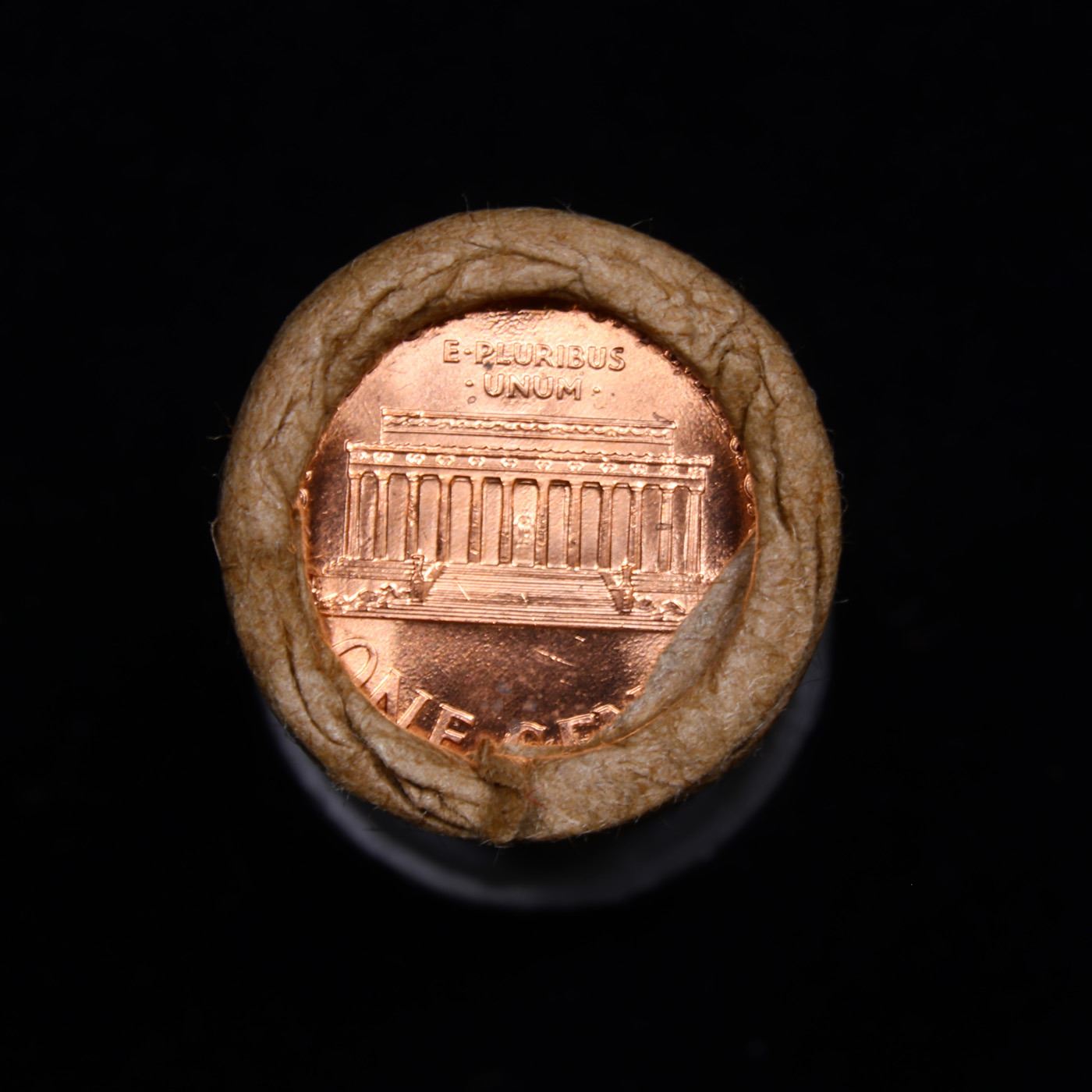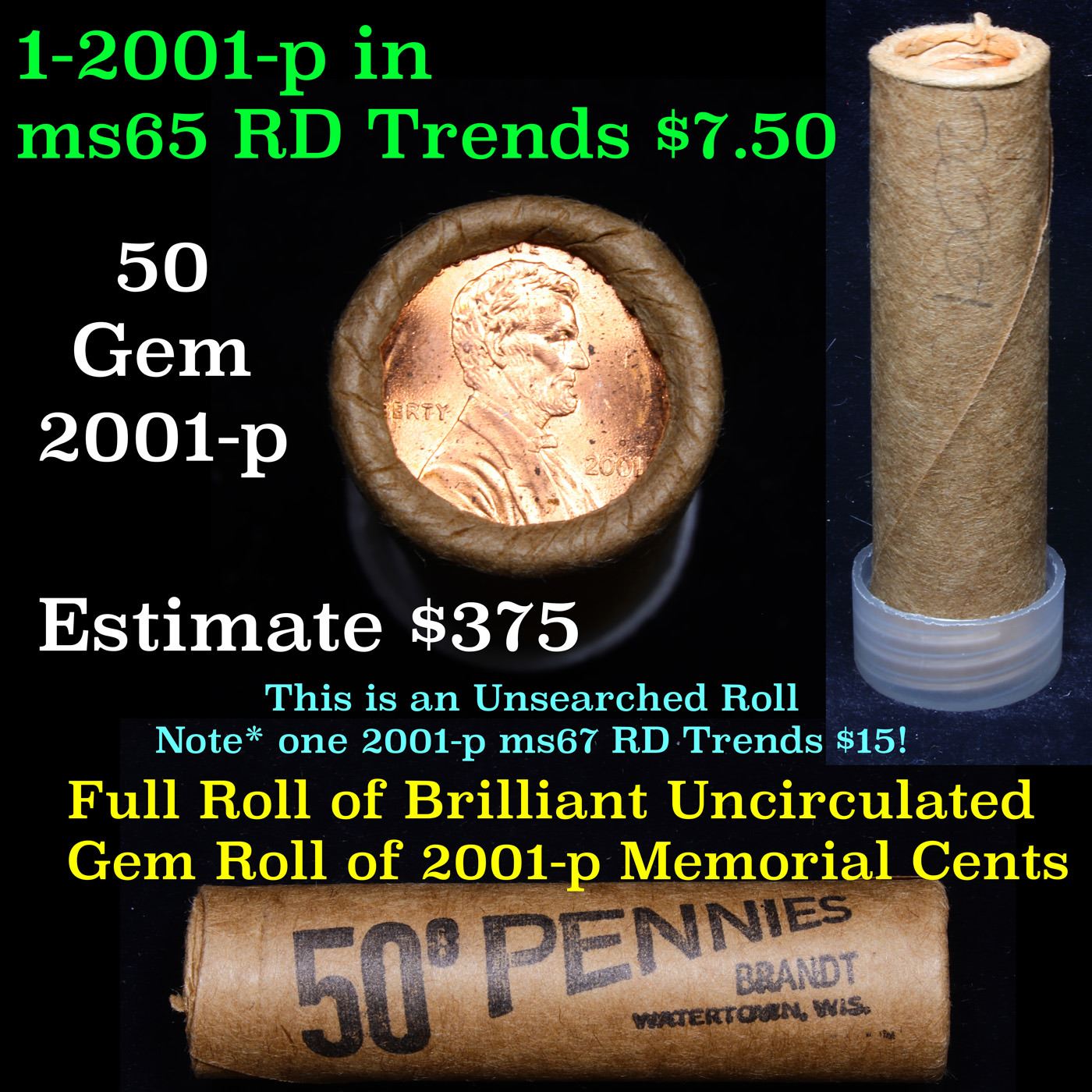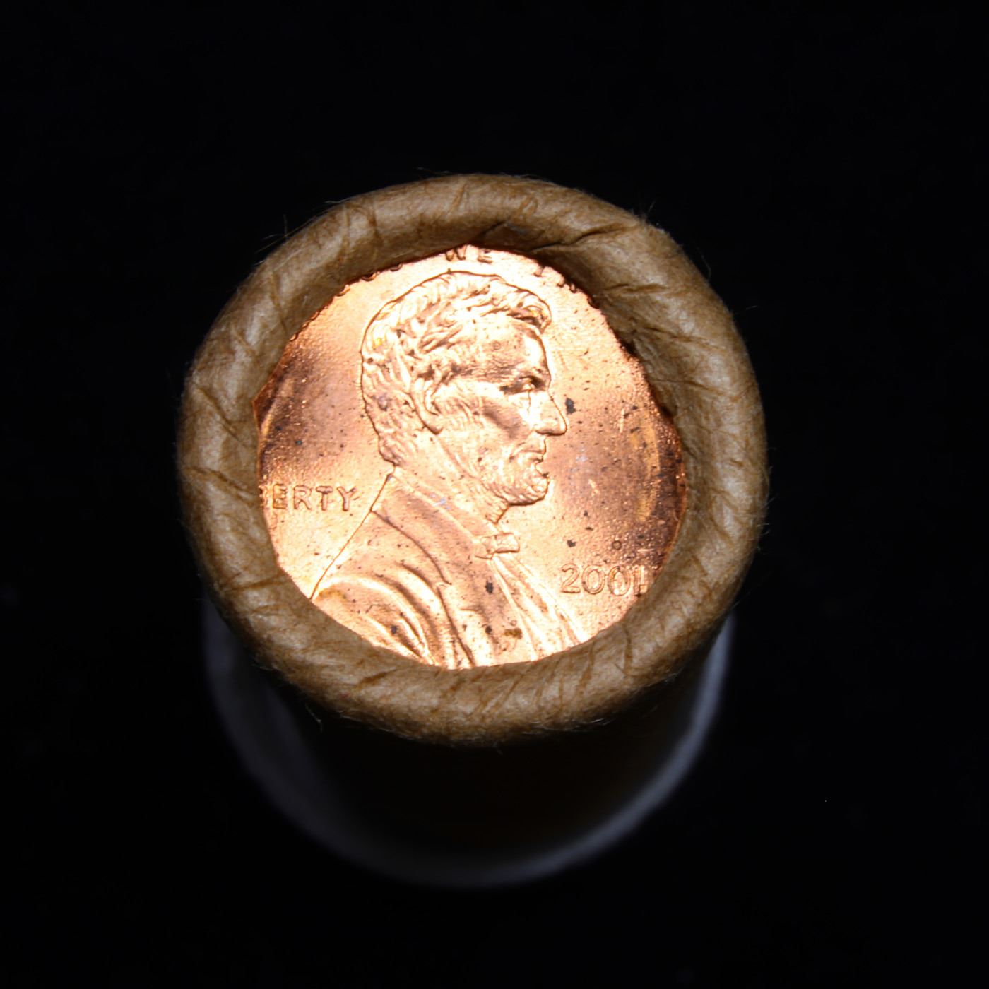 Shotgun Lincoln 1c roll, 2001-p 50 pcs Brandt Wrapper . A terrific Shotgun roll of Lincoln cents. All coins cherry red. Trends ms65 rd $5 Estimate $250