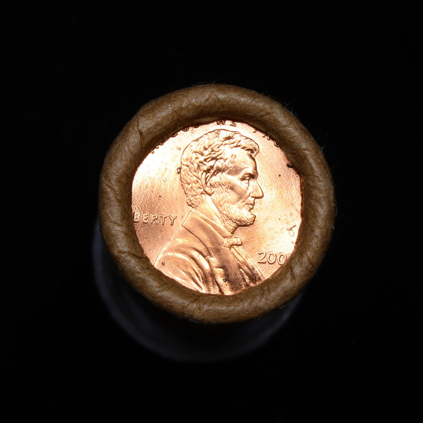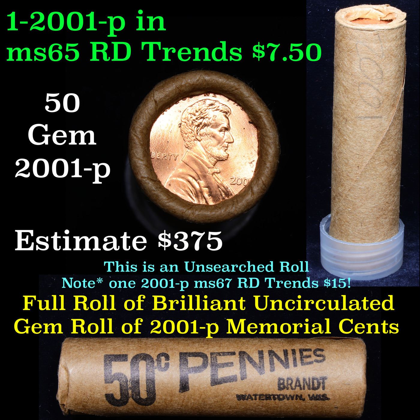 Shotgun Lincoln 1c roll, 2001-p 50 pcs Brandt Wrapper. A terrific Shotgun roll of Lincoln cents. All coins cherry red. Trends ms65 rd $7.50 Estimate $375
