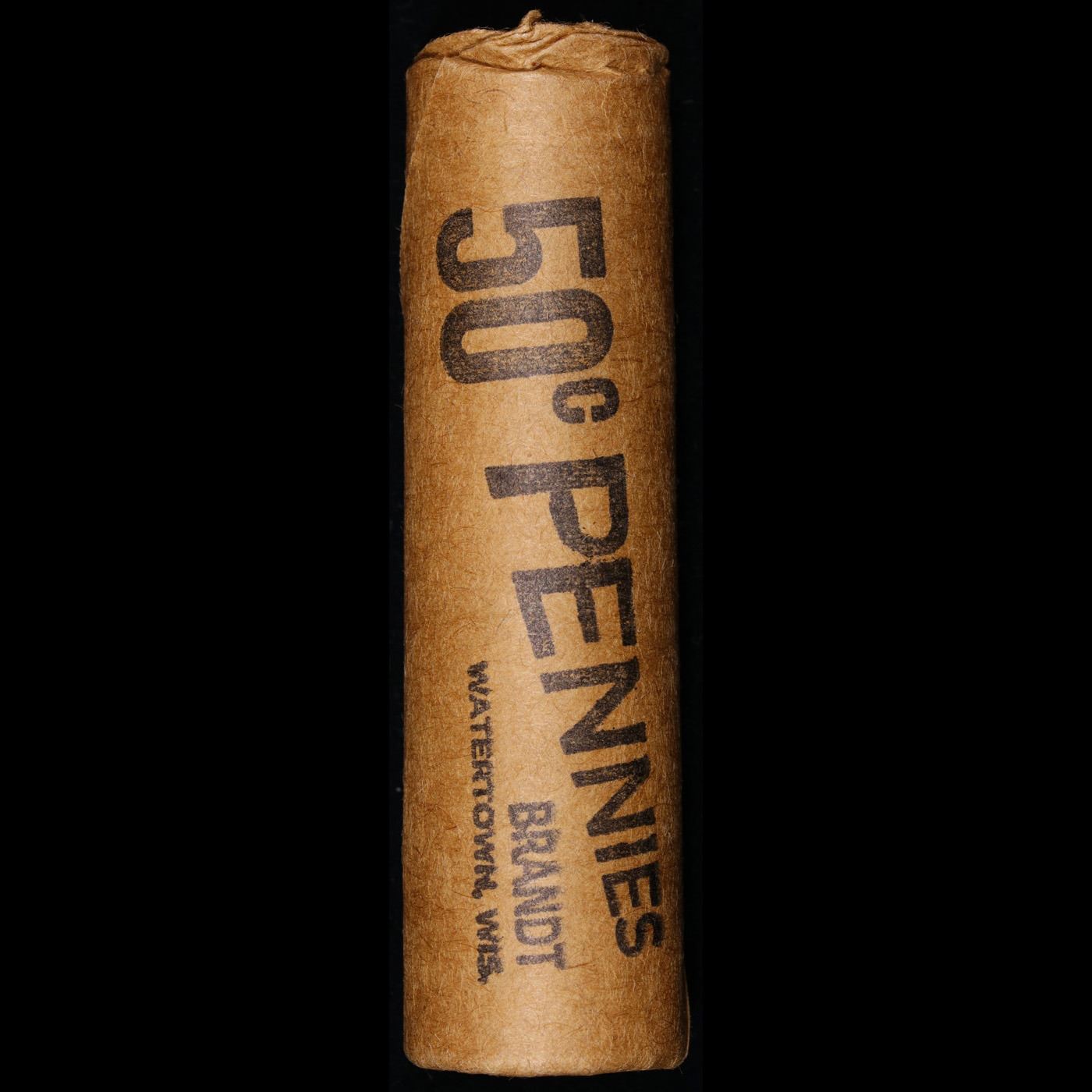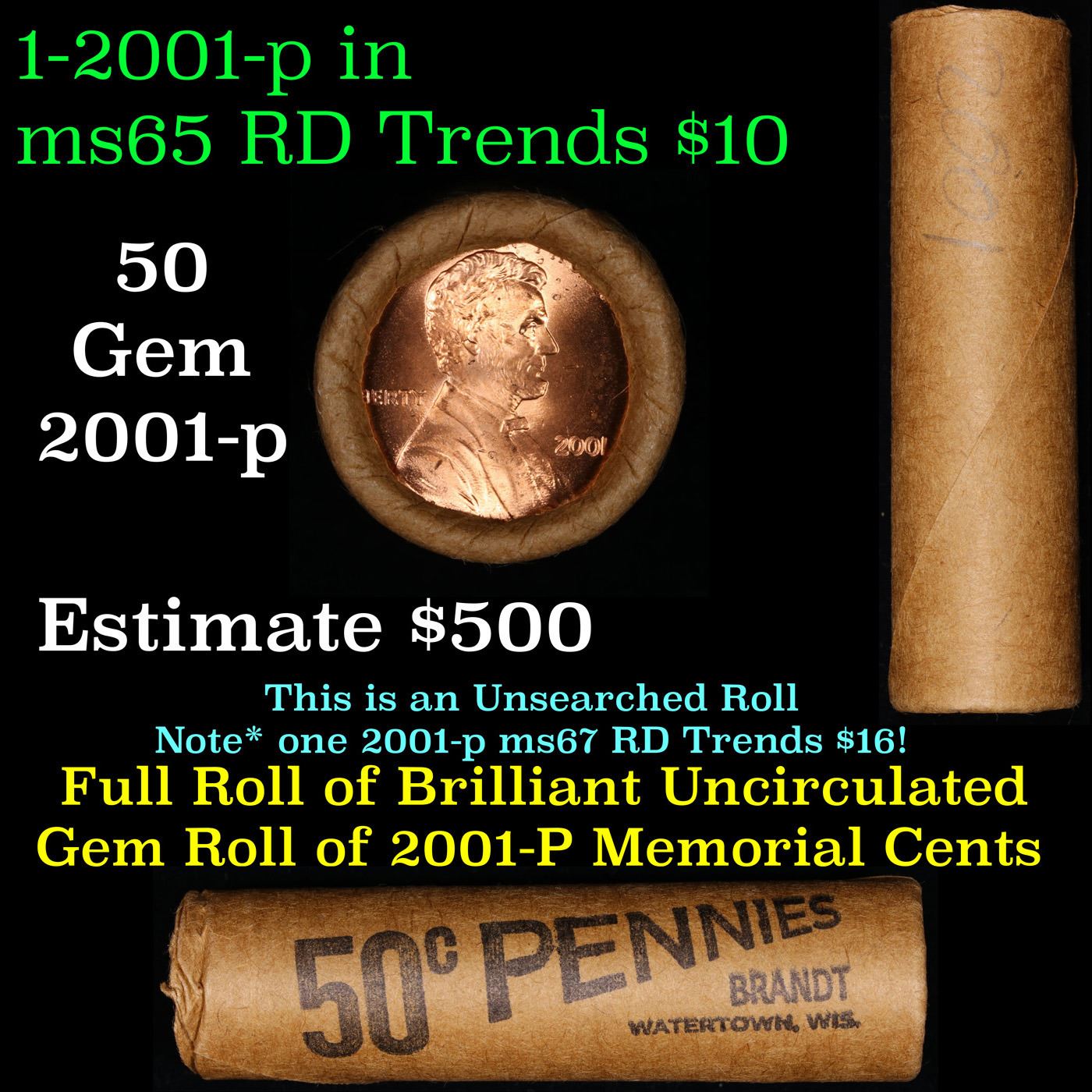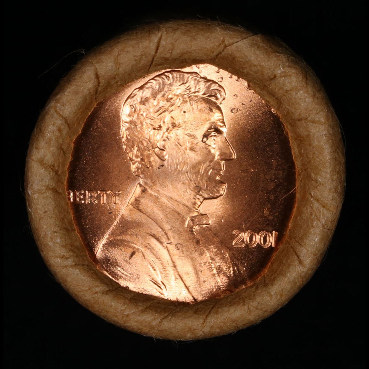 Shotgun Lincoln 1c roll, 2001-p 50 pcs Brandt Wrapper . A terrific Shotgun roll of Lincoln cents. All coins cherry red. Trends ms65 rd $10