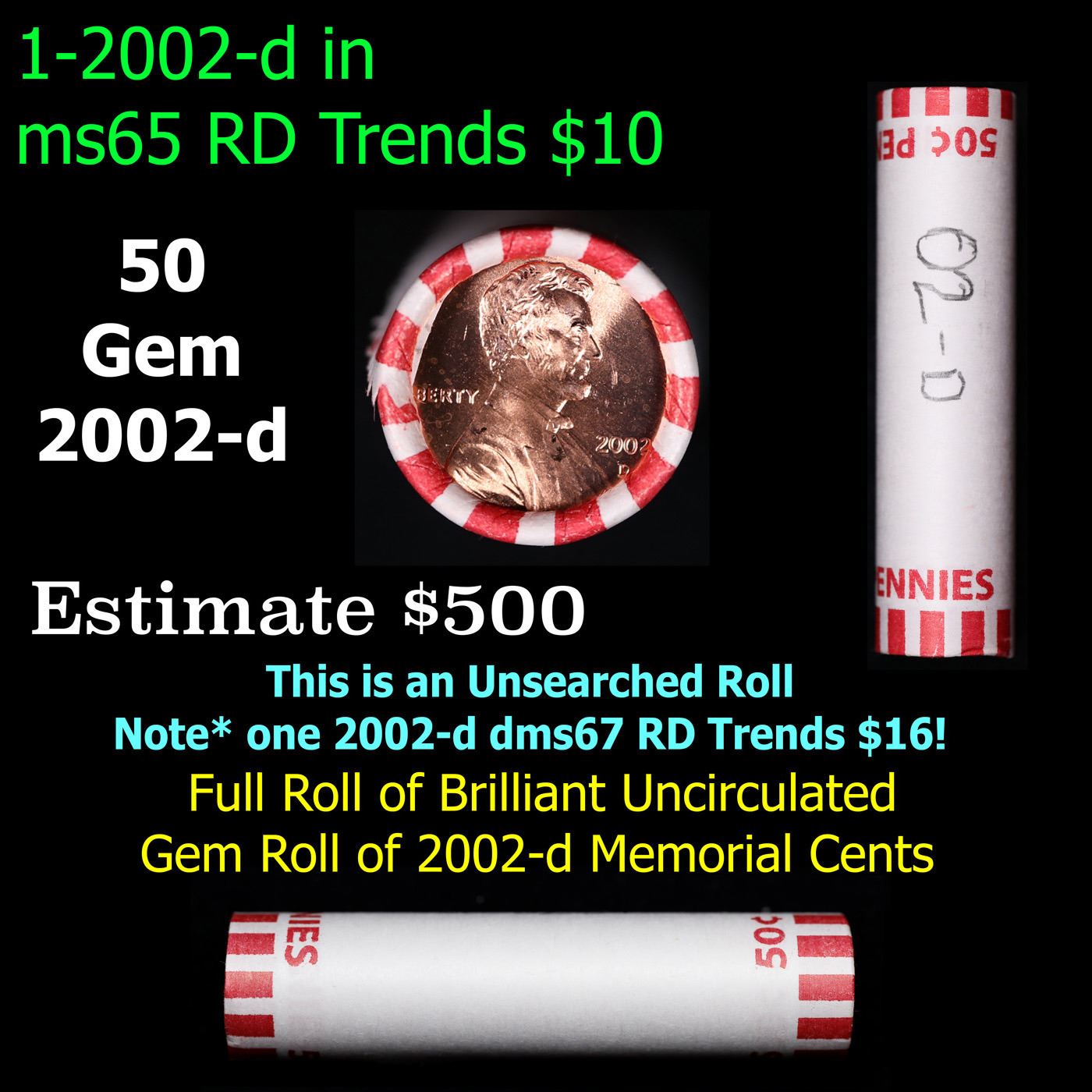Shotgun Lincoln 1c roll, 2002-d 50 pcs Bank Wrapper.. A terrific Shotgun roll of Lincoln cents. Most if not all coin should be cherry red.