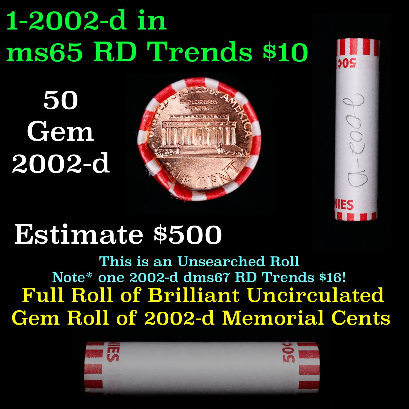 Shotgun Lincoln 1c roll, 2002-d 50 pcs Bank Wrapper.. A terrific Shotgun roll of Lincoln cents. Most if not all coin should be cherry red.