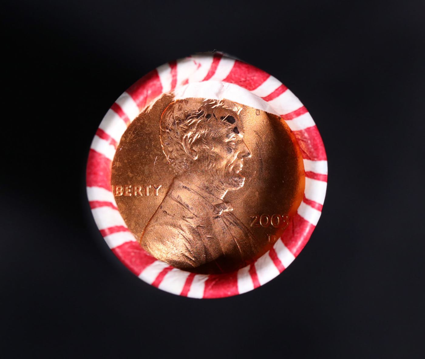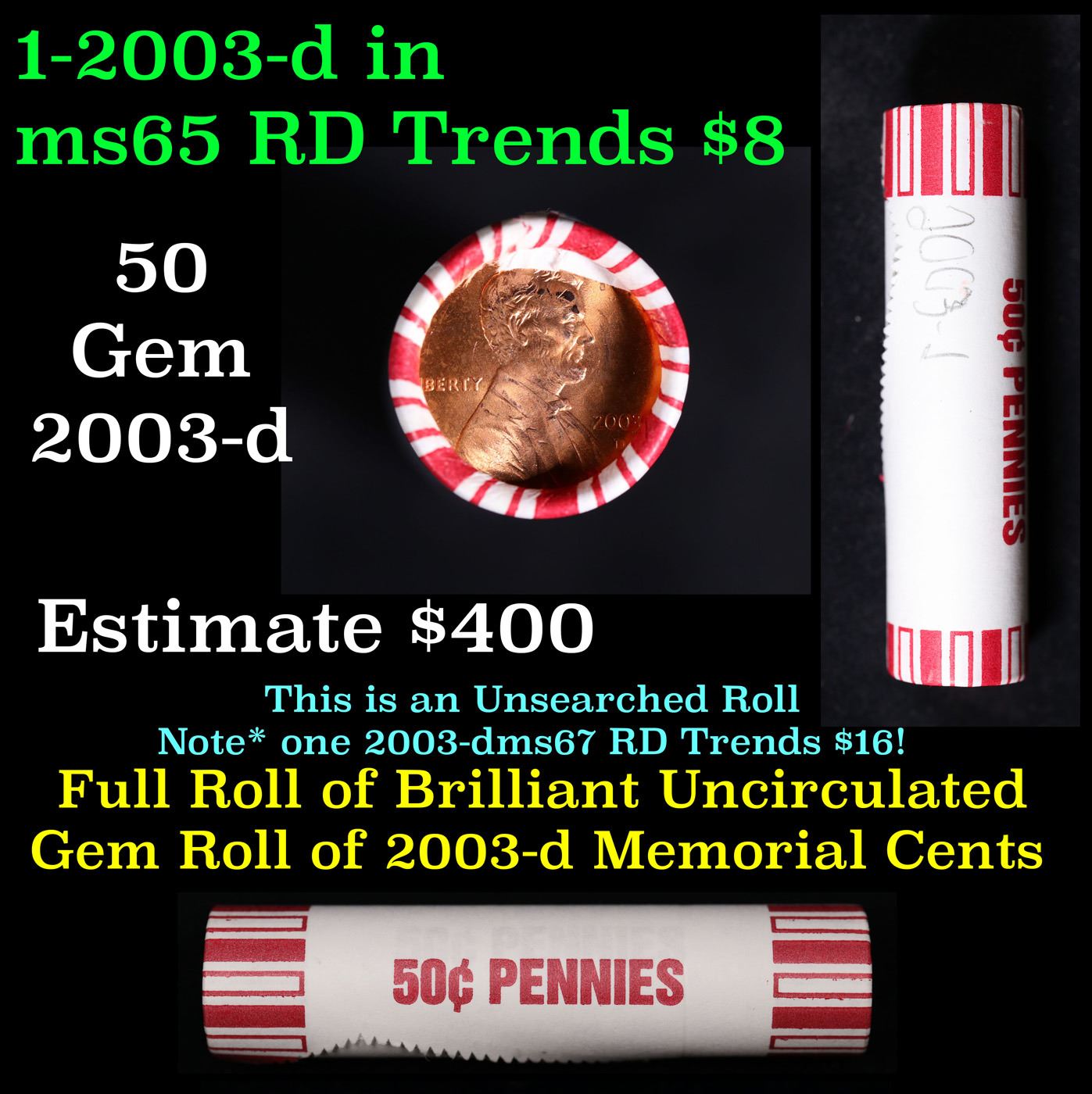 Shotgun Lincoln 1c roll, 2003-d 50 pcs Brandt 50c Wrapper.. A terrific Shotgun roll of Lincoln cents. Most if not all coin should be cherry red.