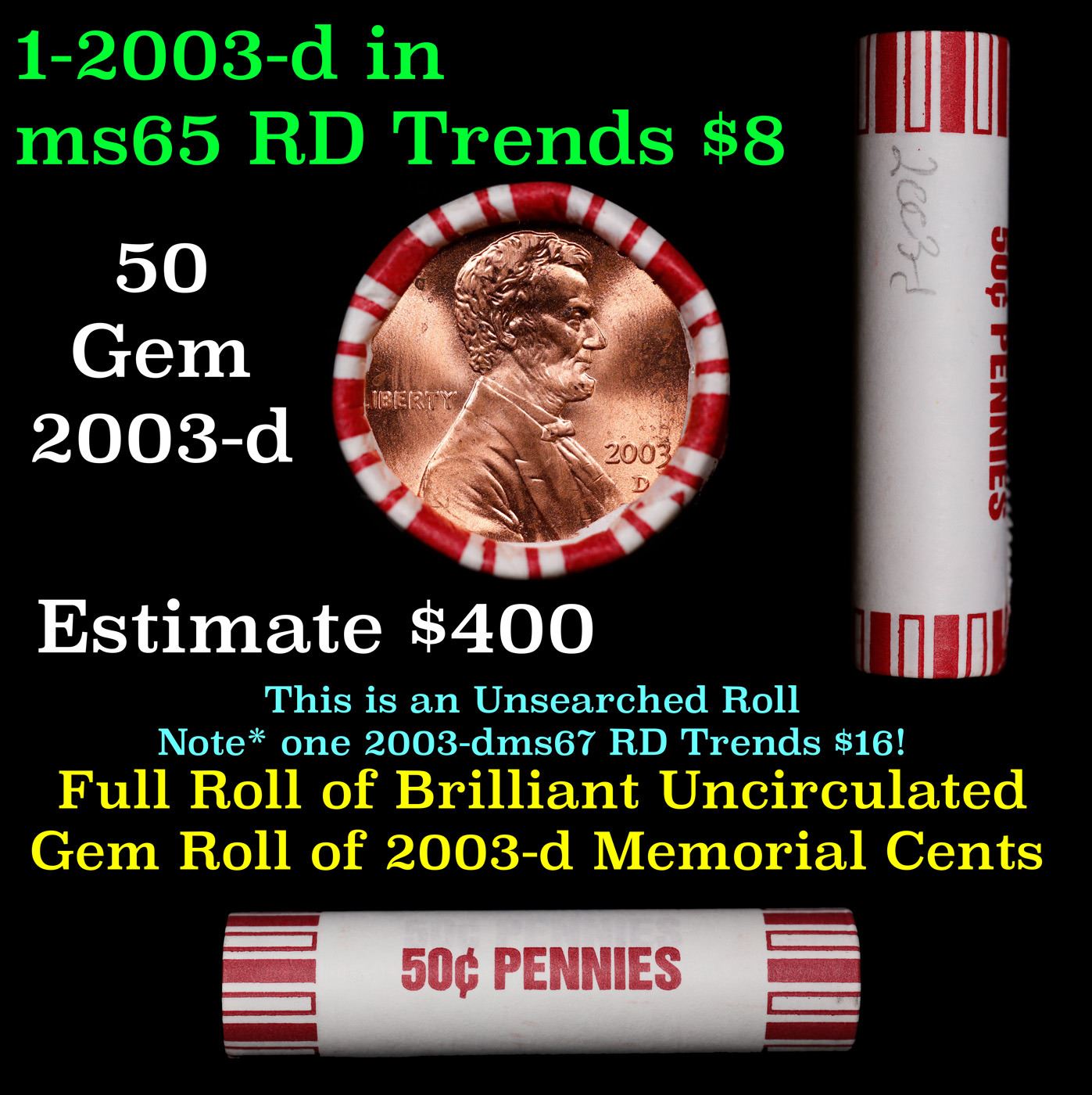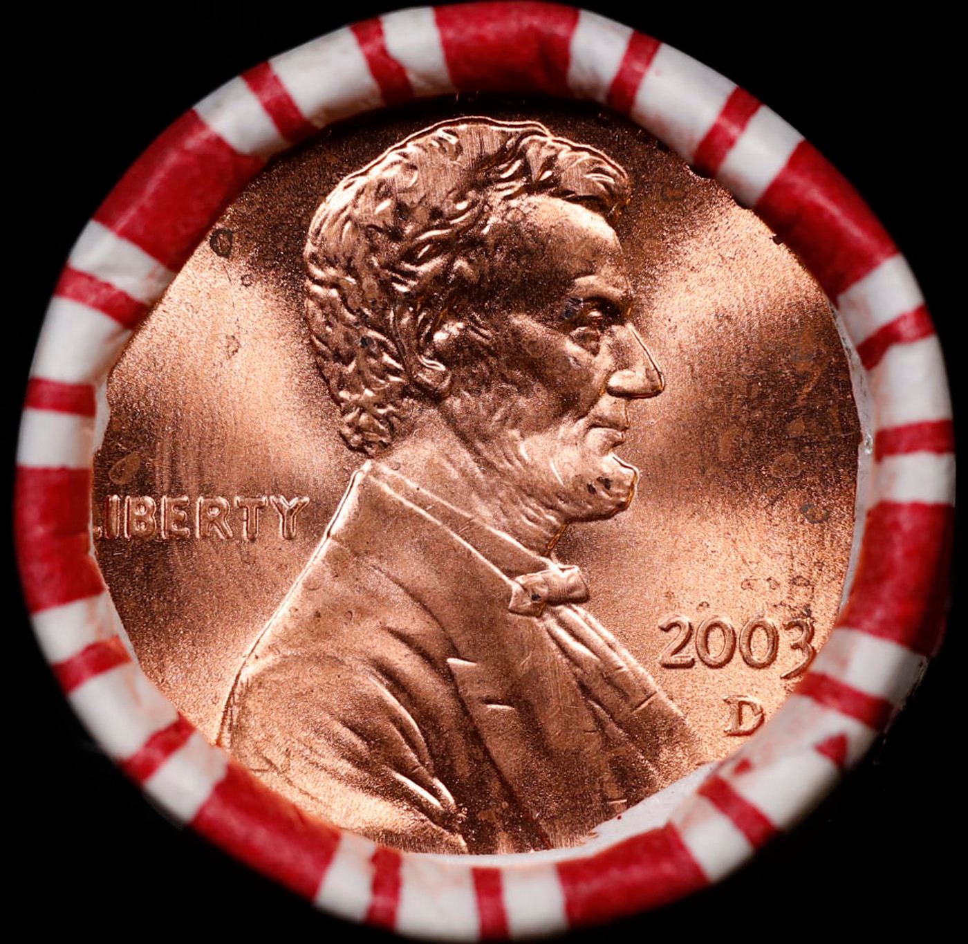 Shotgun Lincoln 1c roll, 2003-d 50 pcs Brandt 50c Wrapper.. A terrific Shotgun roll of Lincoln cents. Most if not all coin should be cherry red.