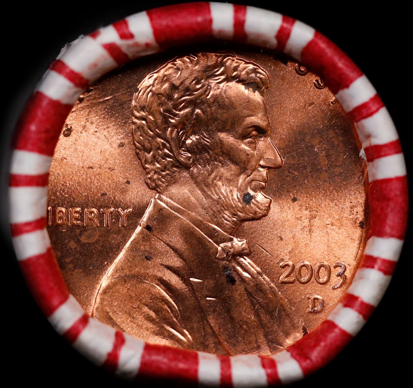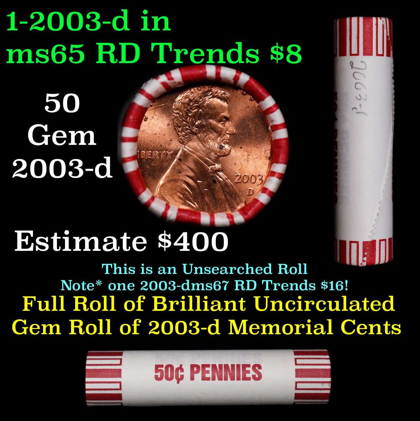 Shotgun Lincoln 1c roll, 2003-d 50 pcs Brandt 50c Wrapper.. A terrific Shotgun roll of Lincoln cents. Most if not all coin should be cherry red.