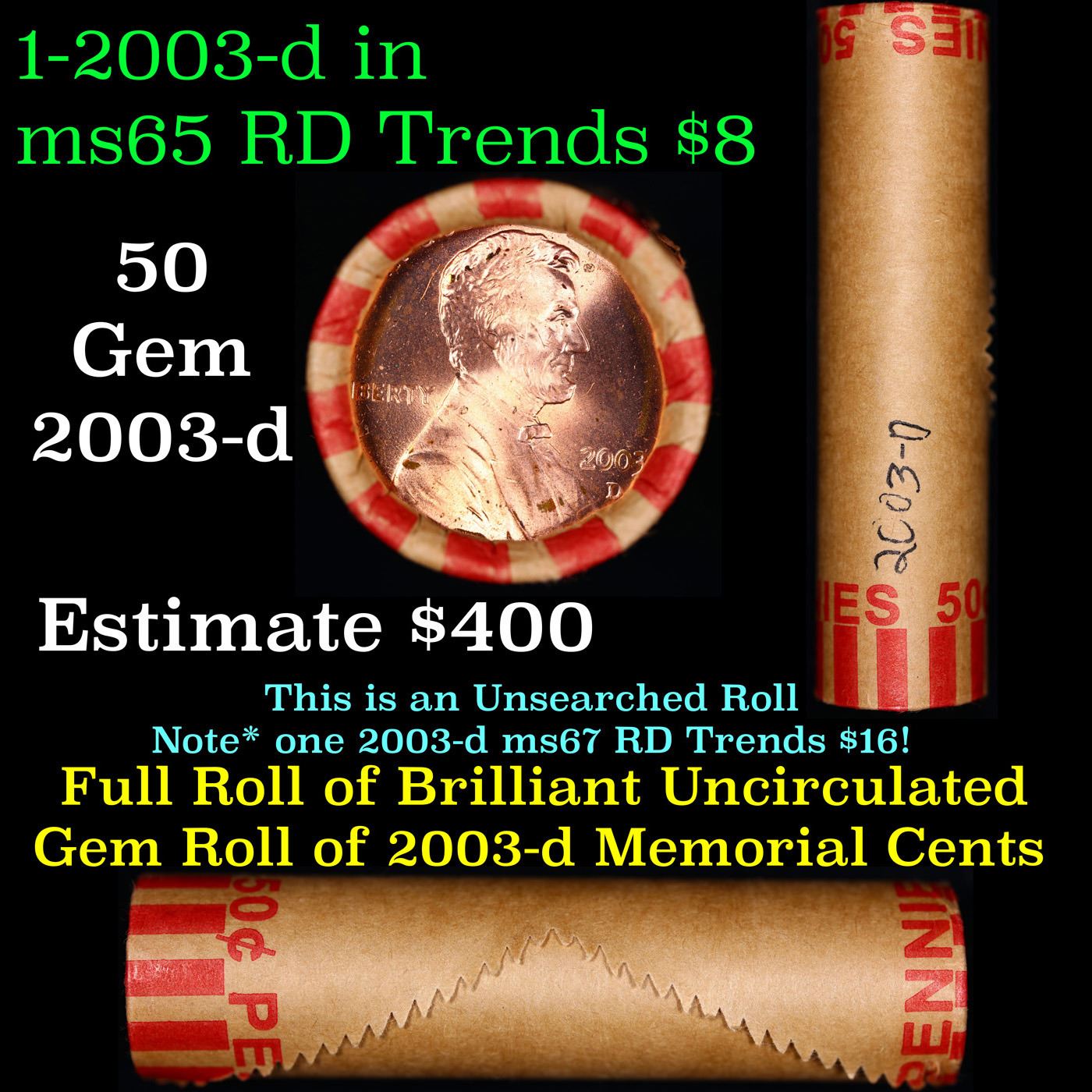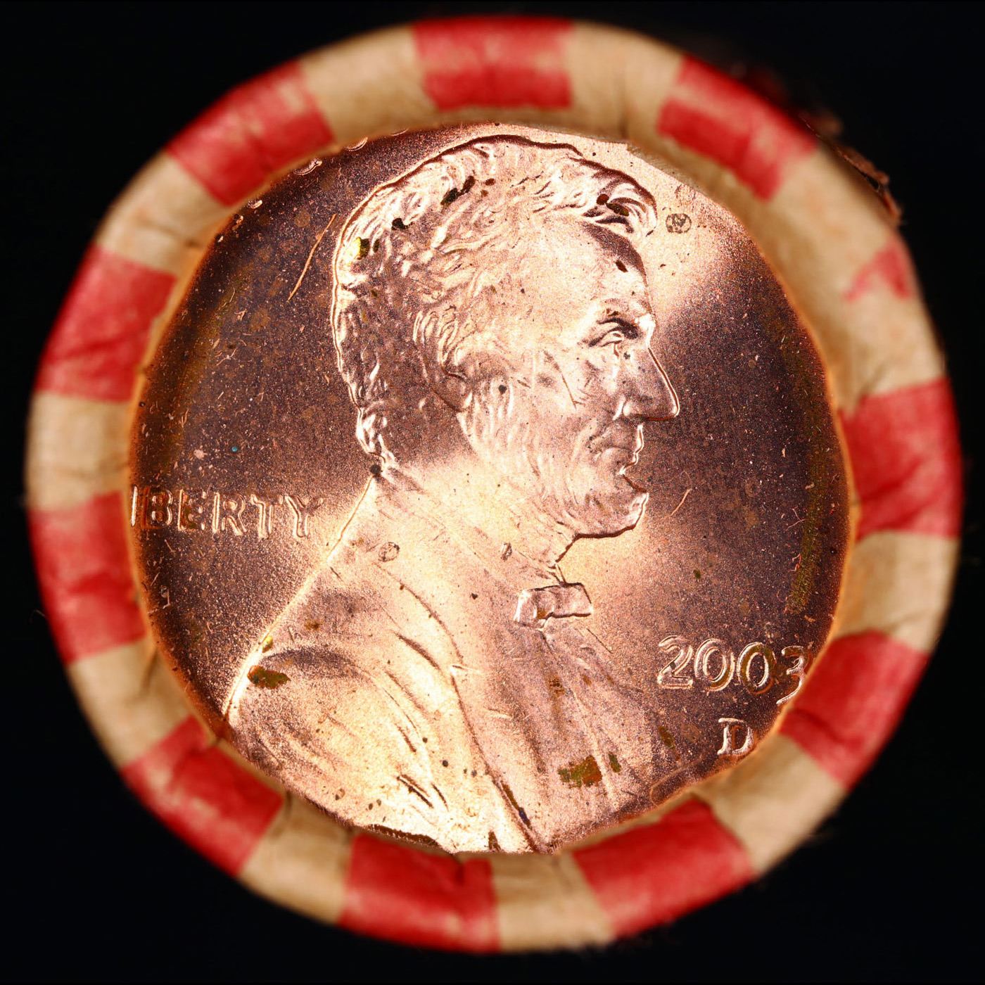 Shotgun Lincoln 1c roll, 2003-d 50 pcs Brandt Wrapper . A terrific Shotgun roll of Lincoln cents. All coins cherry red. Trends ms65 rd $8