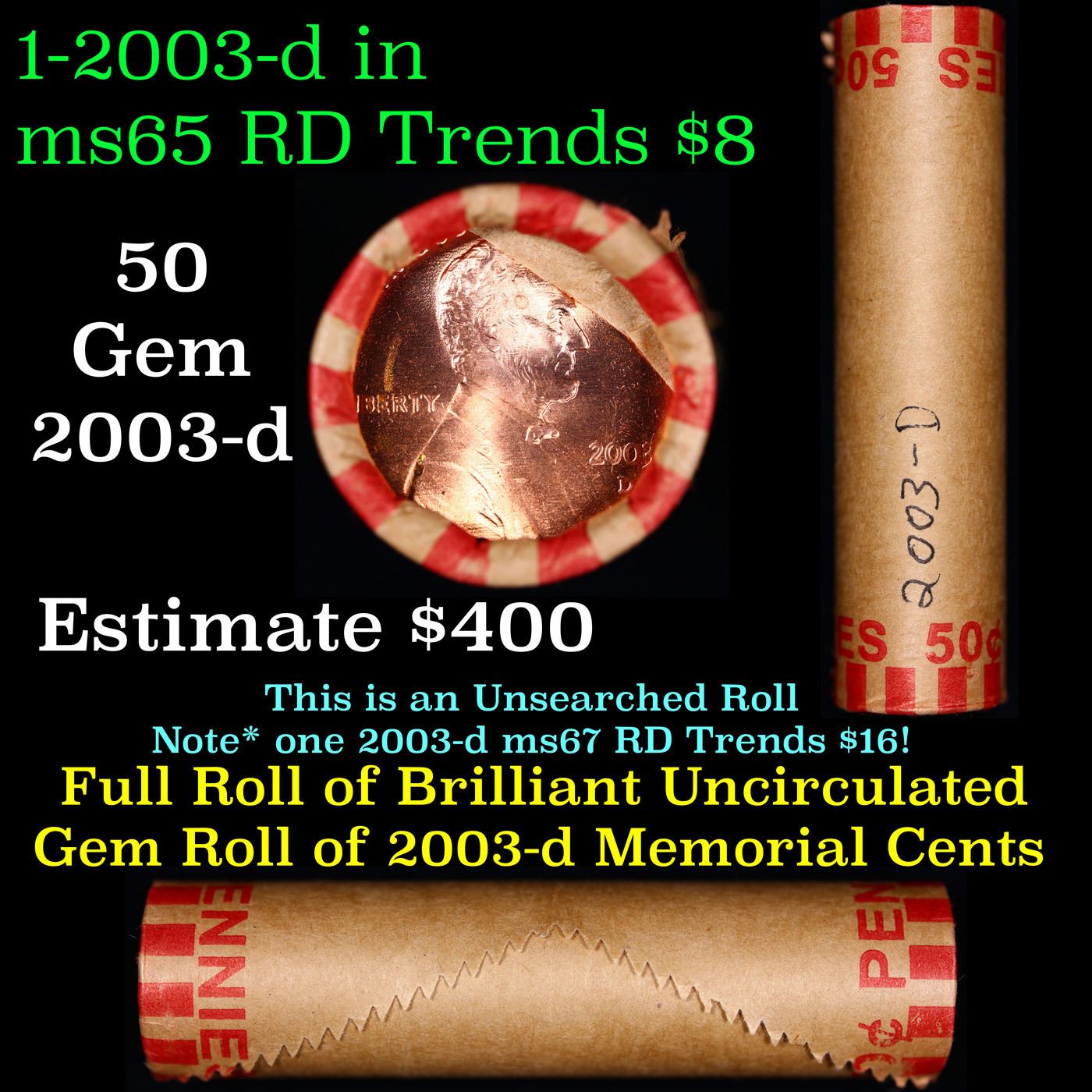 Shotgun Lincoln 1c roll, 2003-d 50 pcs Brandt Wrapper . A terrific Shotgun roll of Lincoln cents. All coins cherry red. Trends ms65 rd $8