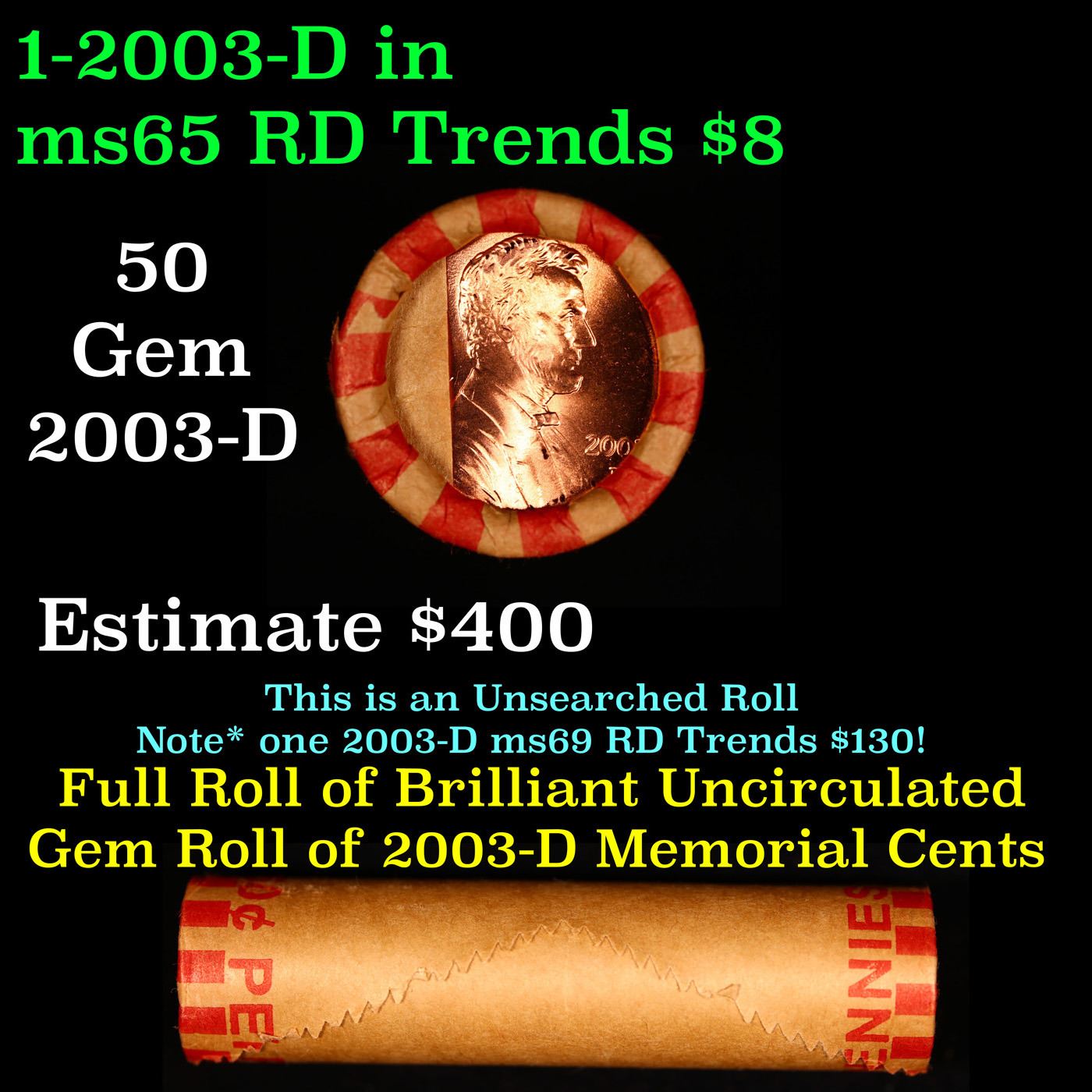 Shotgun Lincoln 1c roll, 2003-d 50 pcs Old Bank Style Wrapper. A terrific Shotgun roll of Lincoln cents. All coins cherry red. Trends ms65 rd $16