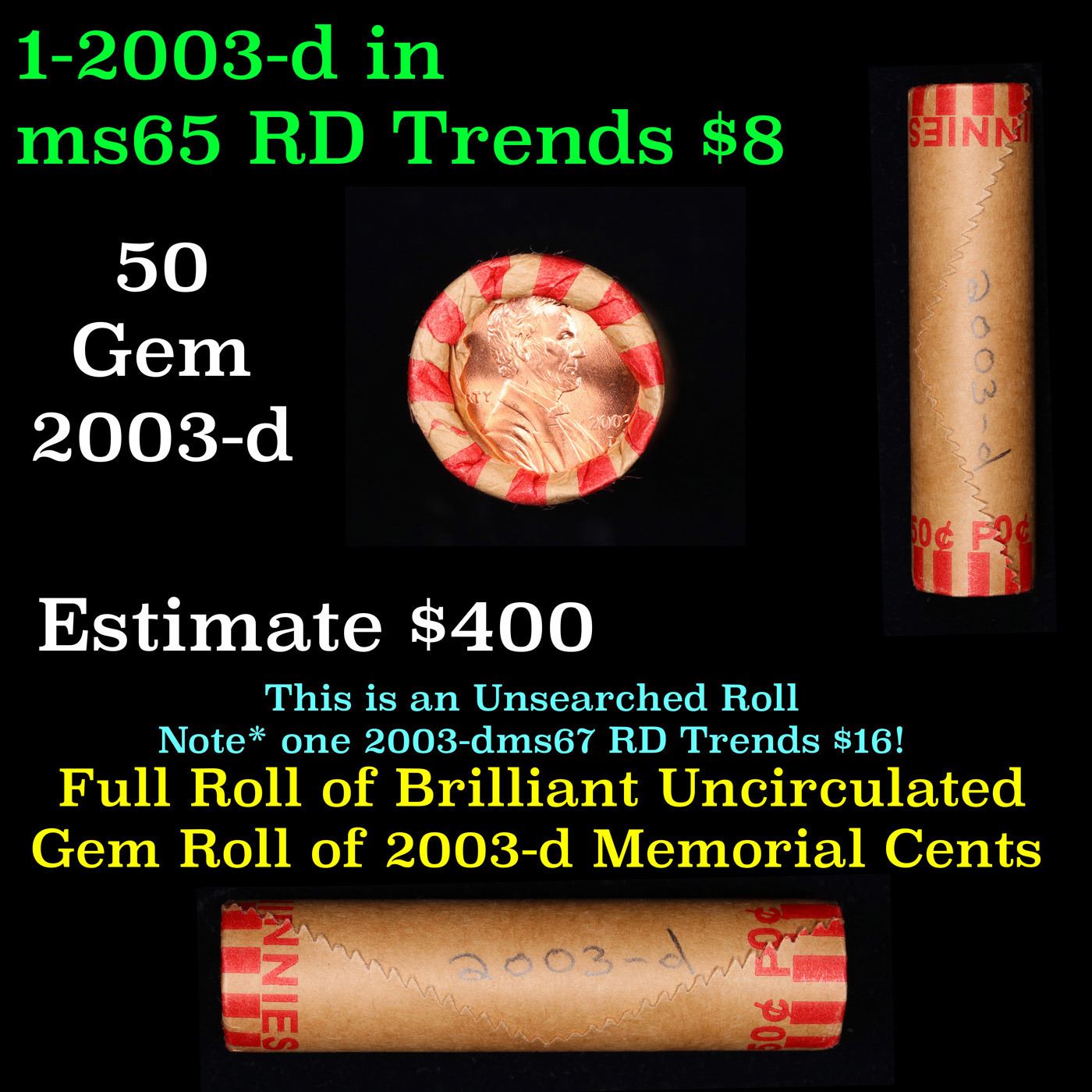 Shotgun Lincoln 1c roll, 2003-d 50 pcs Pennies Wrapper.. A terrific Shotgun roll of Lincoln cents. Most if not all coin should be cherry red.
