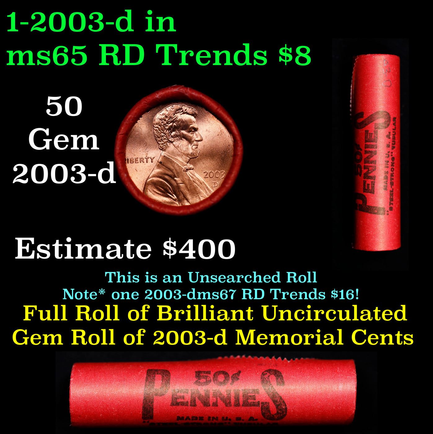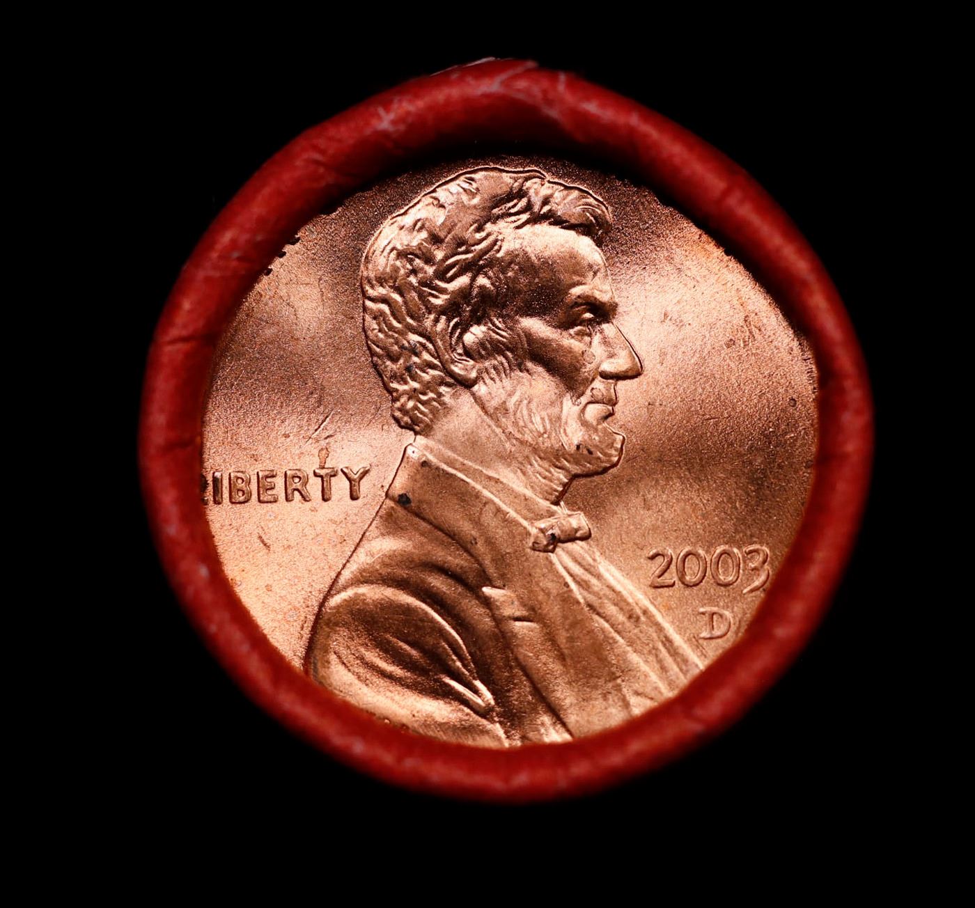 Shotgun Lincoln 1c roll, 2003-d 50 pcs Steel-Strong Wrapper.. A terrific Shotgun roll of Lincoln cents. Most if not all coin should be cherry red.