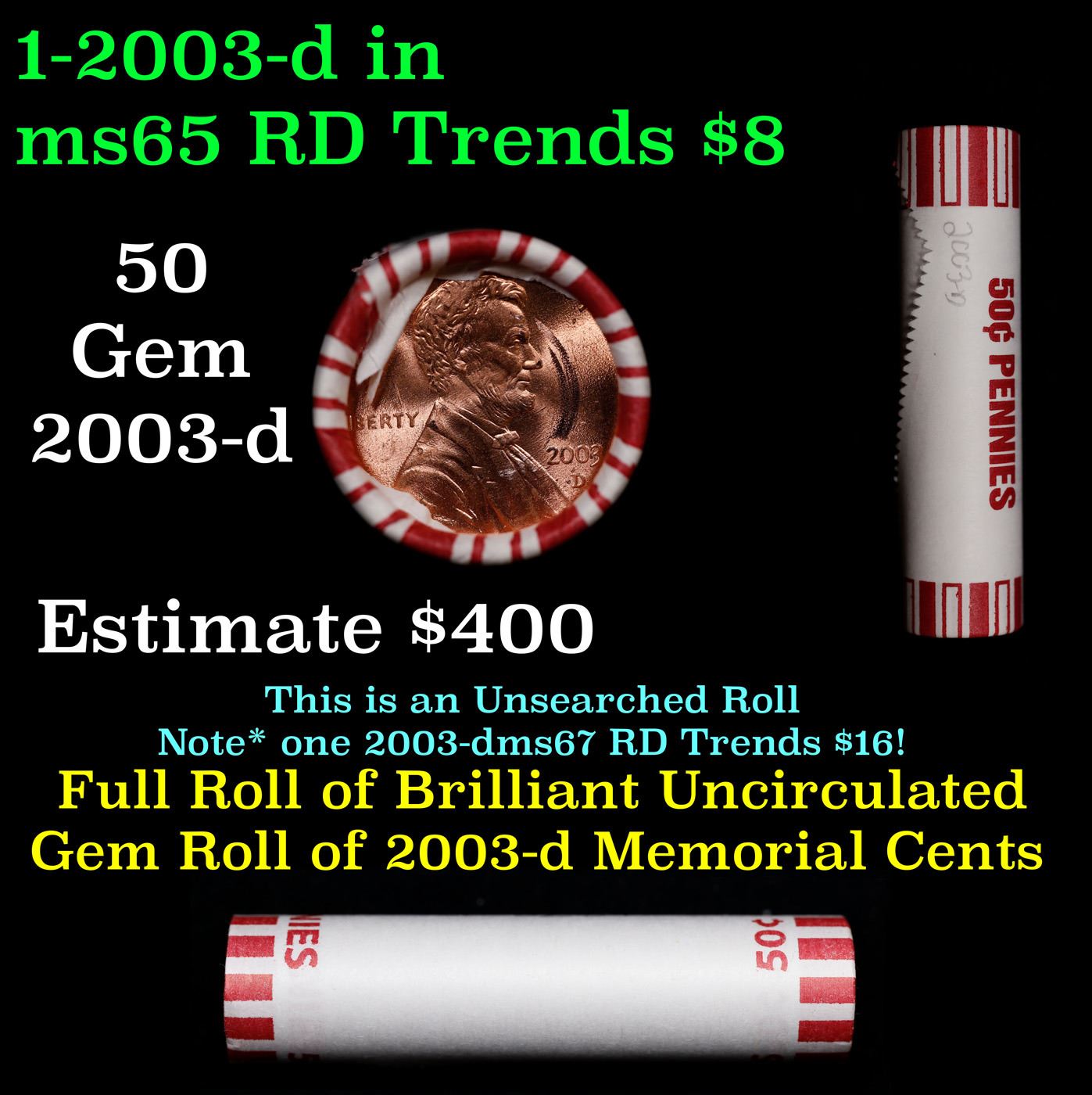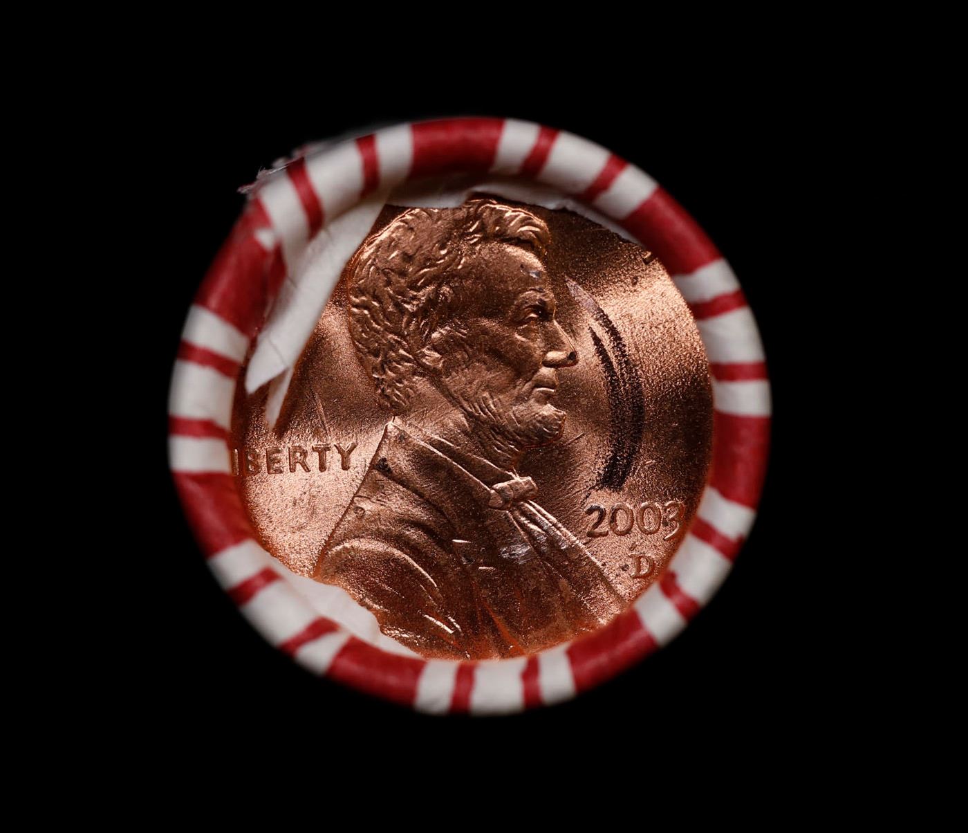 Shotgun Lincoln 1c roll, 2003-d 50 pcs Steel-Strong Wrapper.. A terrific Shotgun roll of Lincoln cents. Most if not all coin should be cherry red.