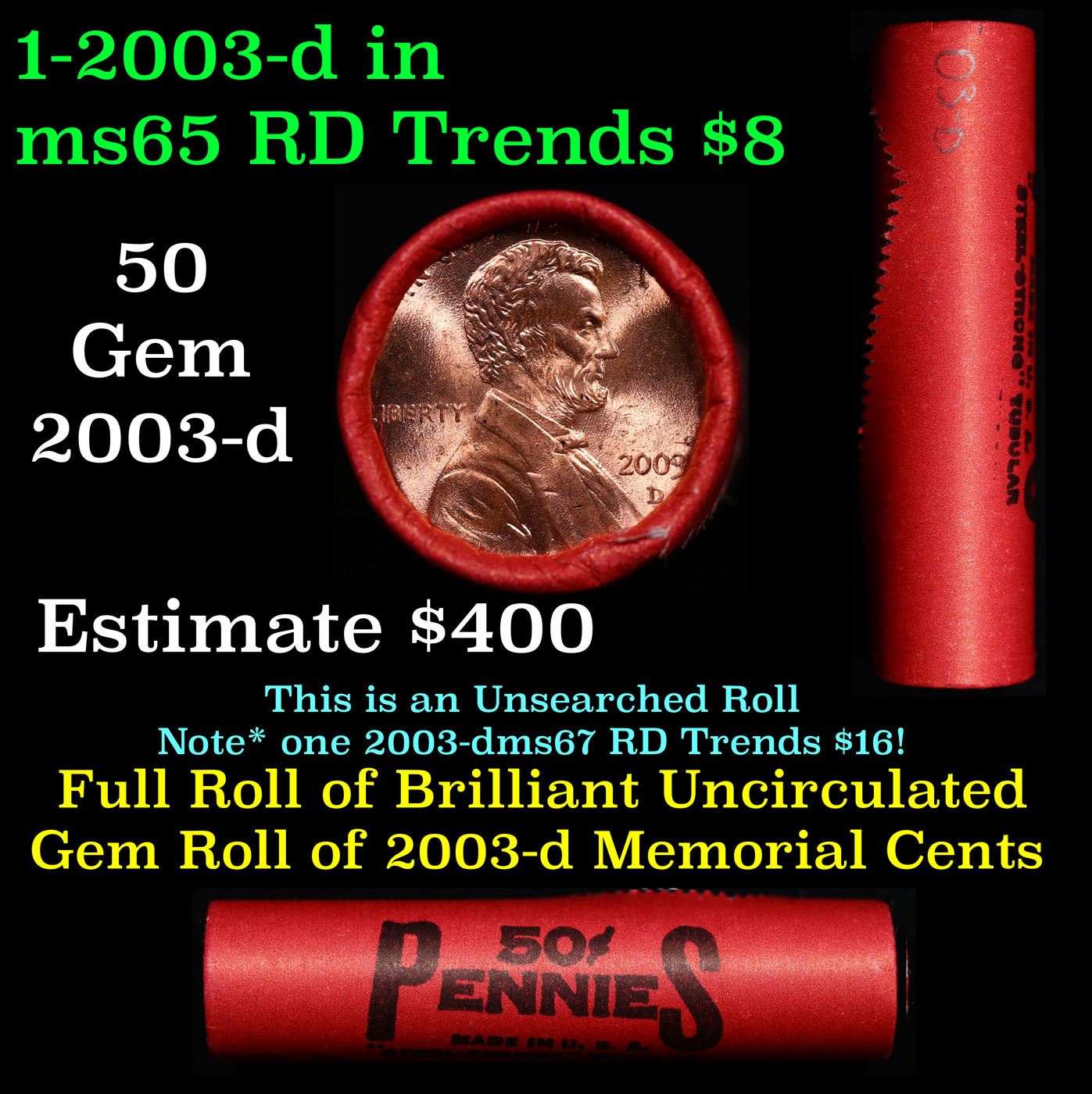 Shotgun Lincoln 1c roll, 2003-d 50 pcs Steel Strong Wrapper.. A terrific Shotgun roll of Lincoln cents. Most if not all coin should be cherry red.
