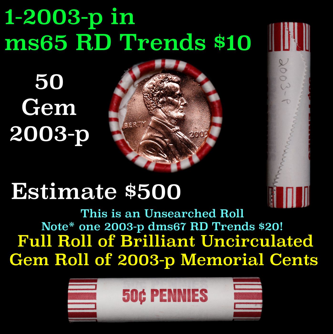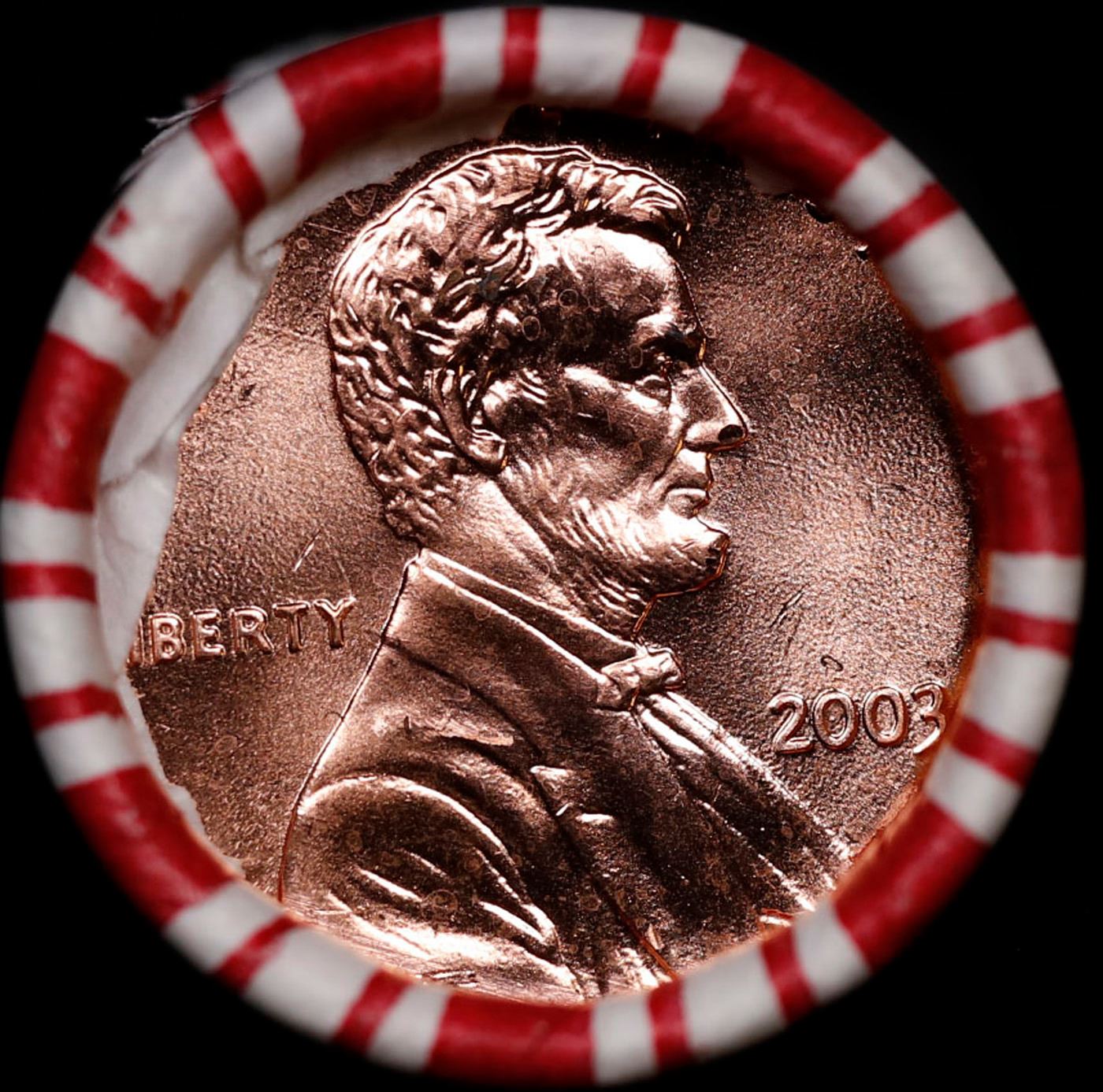 Shotgun Lincoln 1c roll, 2003-p 50 pcs Brandt 50c Wrapper.. A terrific Shotgun roll of Lincoln cents. Most if not all coin should be cherry red.