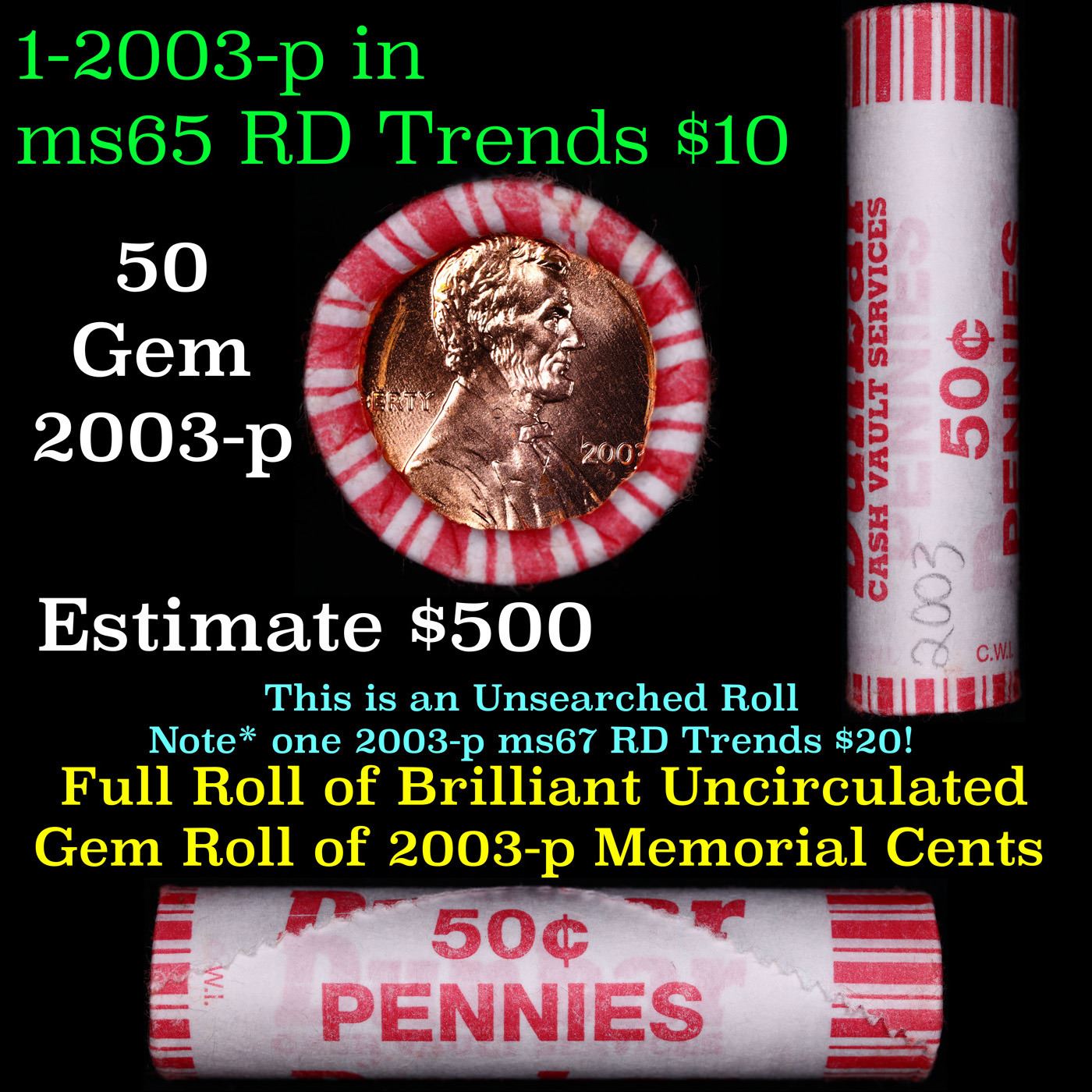 Shotgun Lincoln 1c roll, 2003-p 50 pcs Dunbar Wrapper. A terrific Shotgun roll of Lincoln cents. All coins cherry red. Trends ms65 rd $10