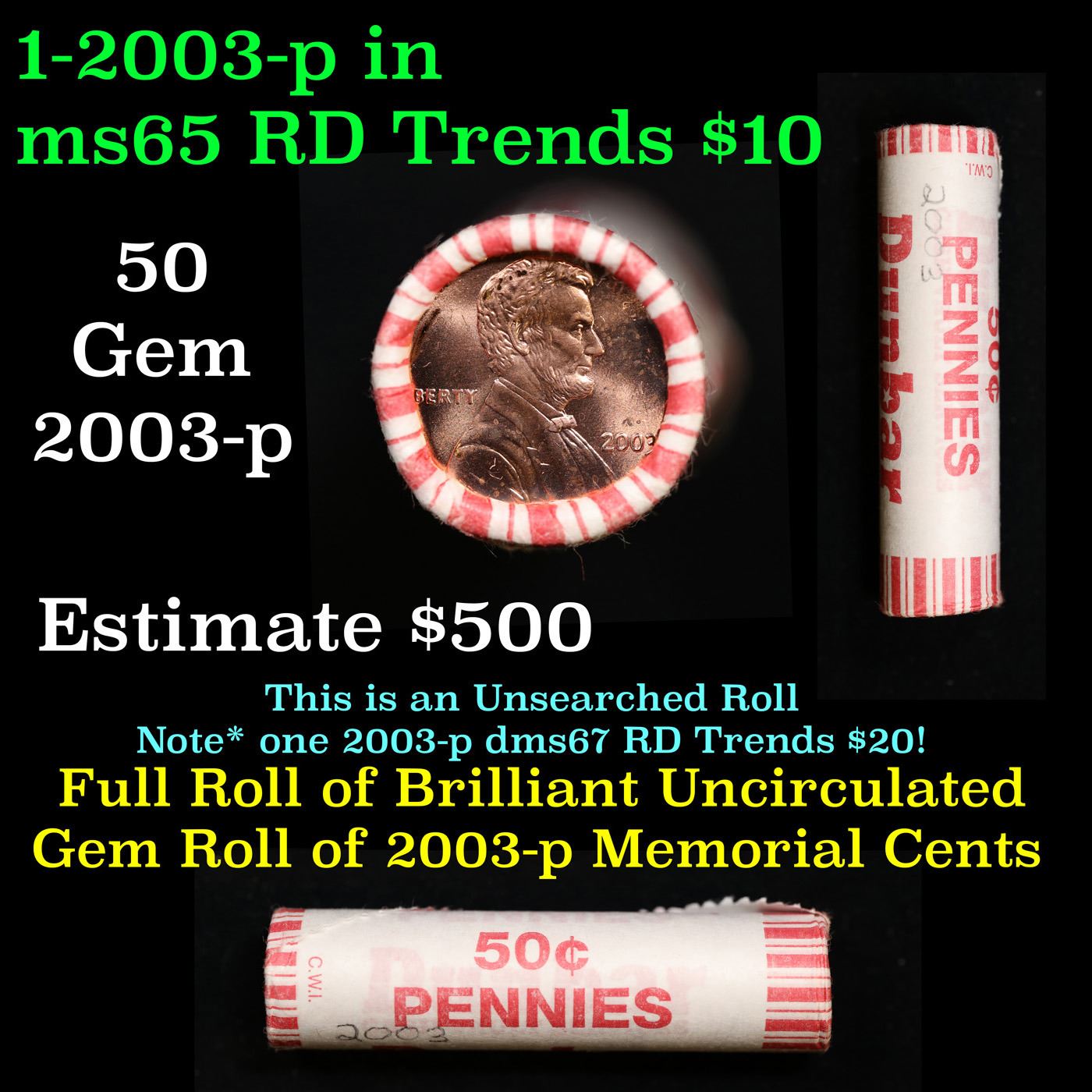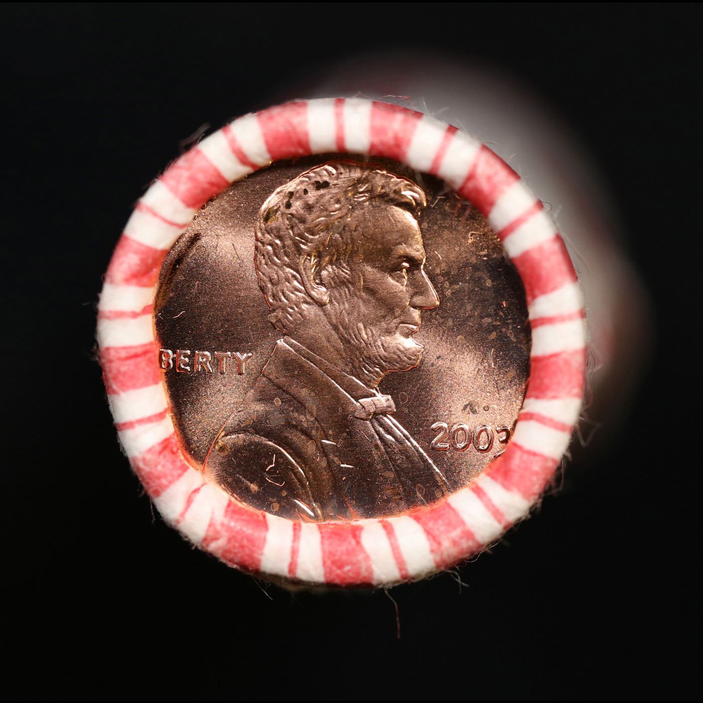 Shotgun Lincoln 1c roll, 2003-p 50 pcs Dunbar Wrapper.. A terrific Shotgun roll of Lincoln cents. Most if not all coin should be cherry red. Trends ms65 rd $10