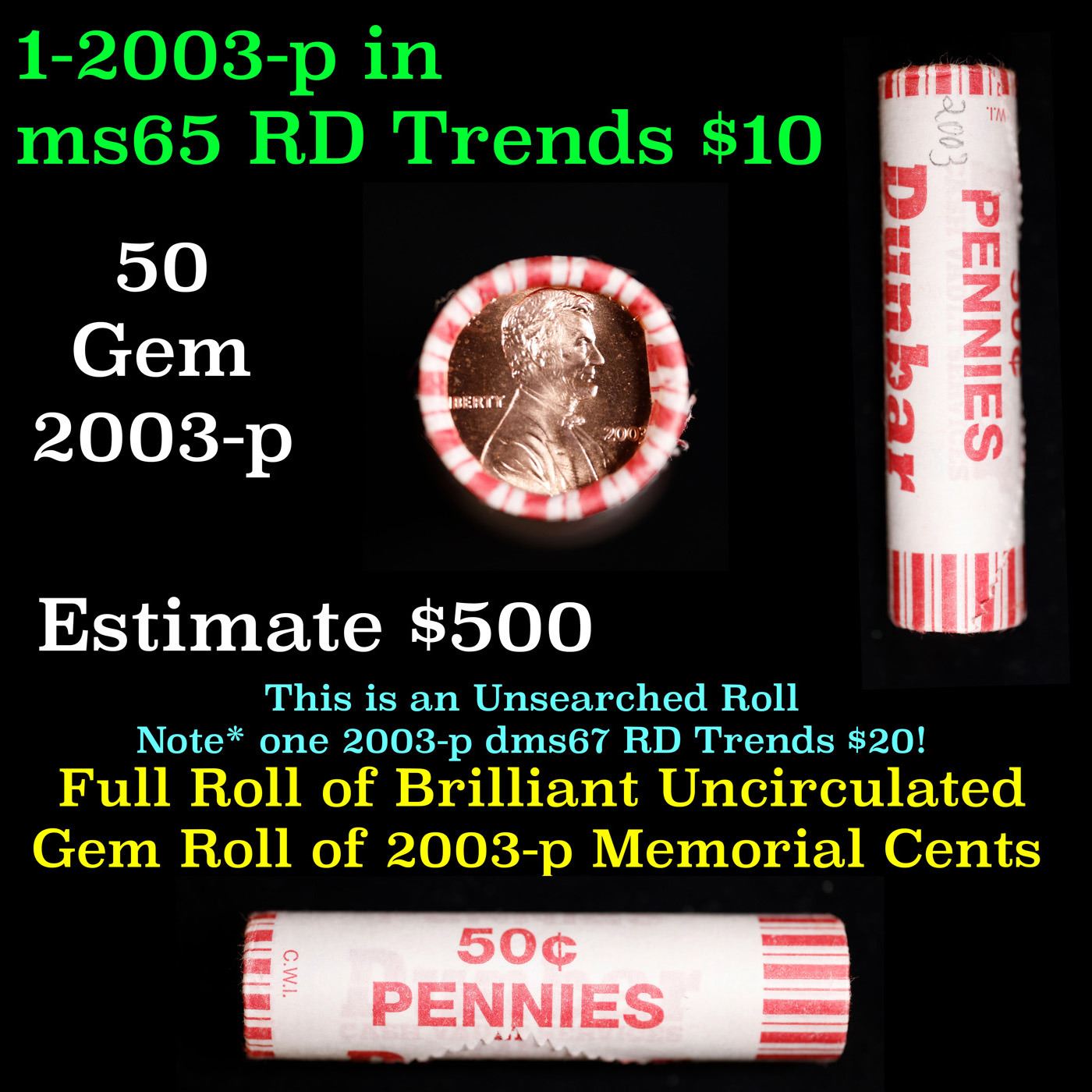 Shotgun Lincoln 1c roll, 2003-p 50 pcs Dunbar Wrapper.. A terrific Shotgun roll of Lincoln cents. Most if not all coin should be cherry red. Trends ms65 rd $18