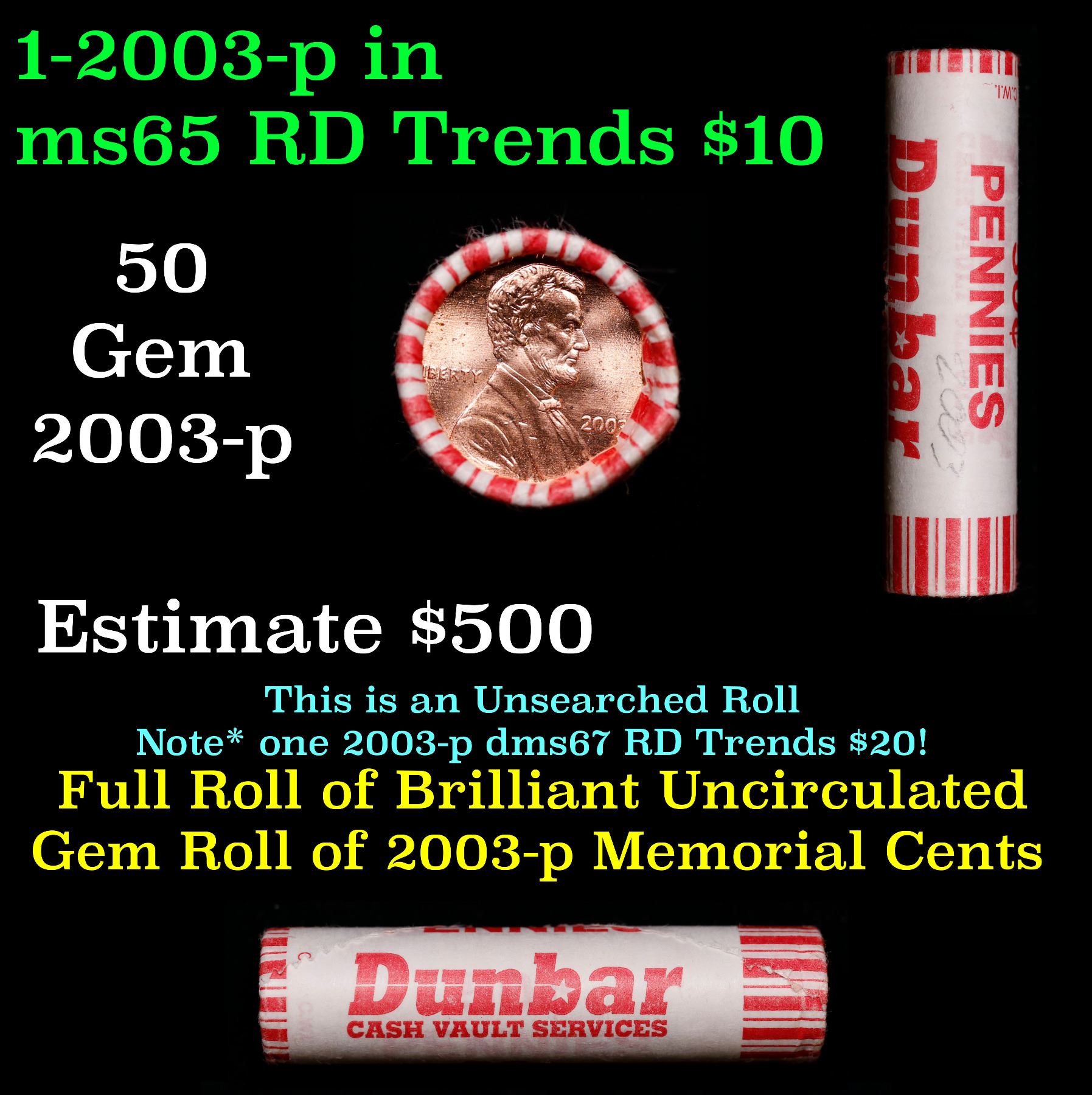 Shotgun Lincoln 1c roll, 2003-p 50 pcs Dunbar Wrapper.. A terrific Shotgun roll of Lincoln cents. Most if not all coin should be cherry red.