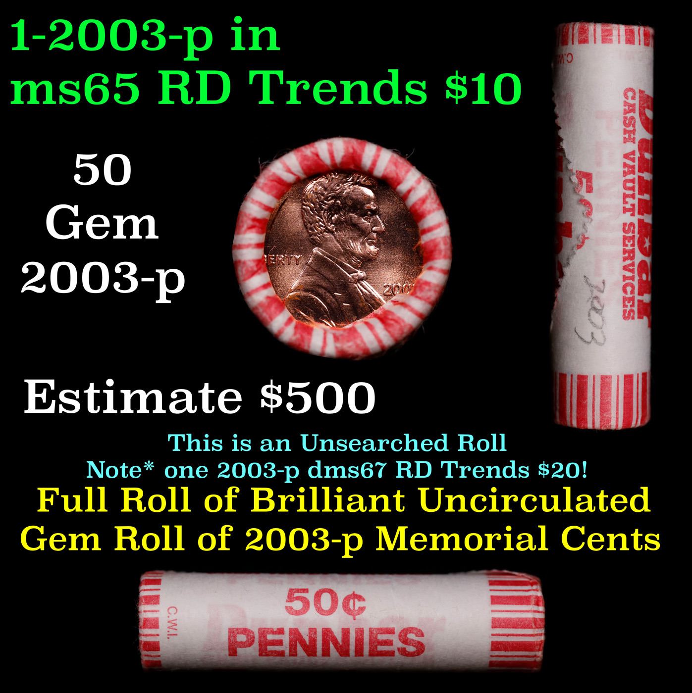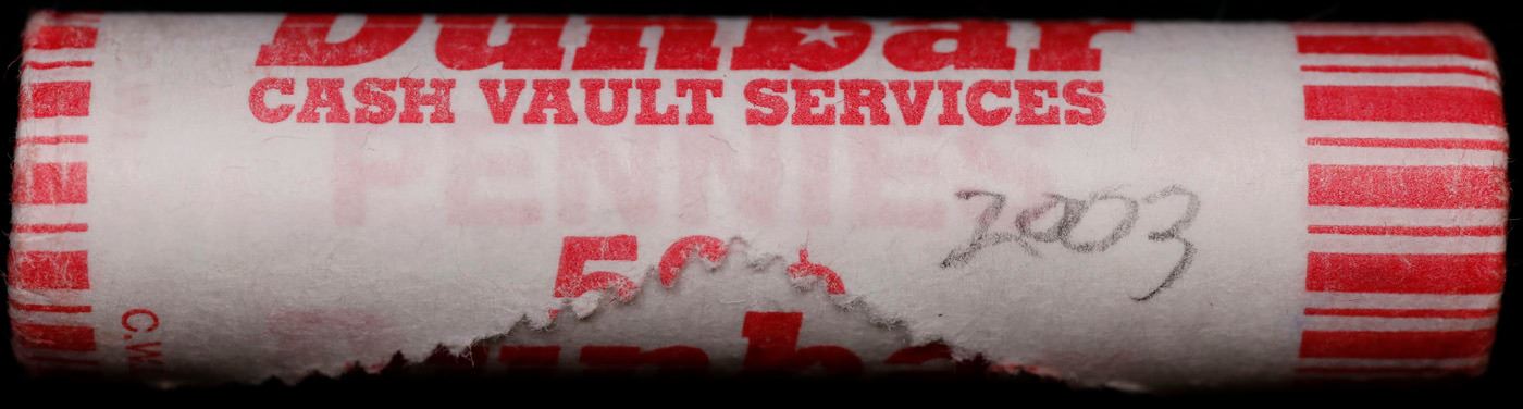 Shotgun Lincoln 1c roll, 2003-p 50 pcs Dunbar Wrapper.. A terrific Shotgun roll of Lincoln cents. Most if not all coin should be cherry red.