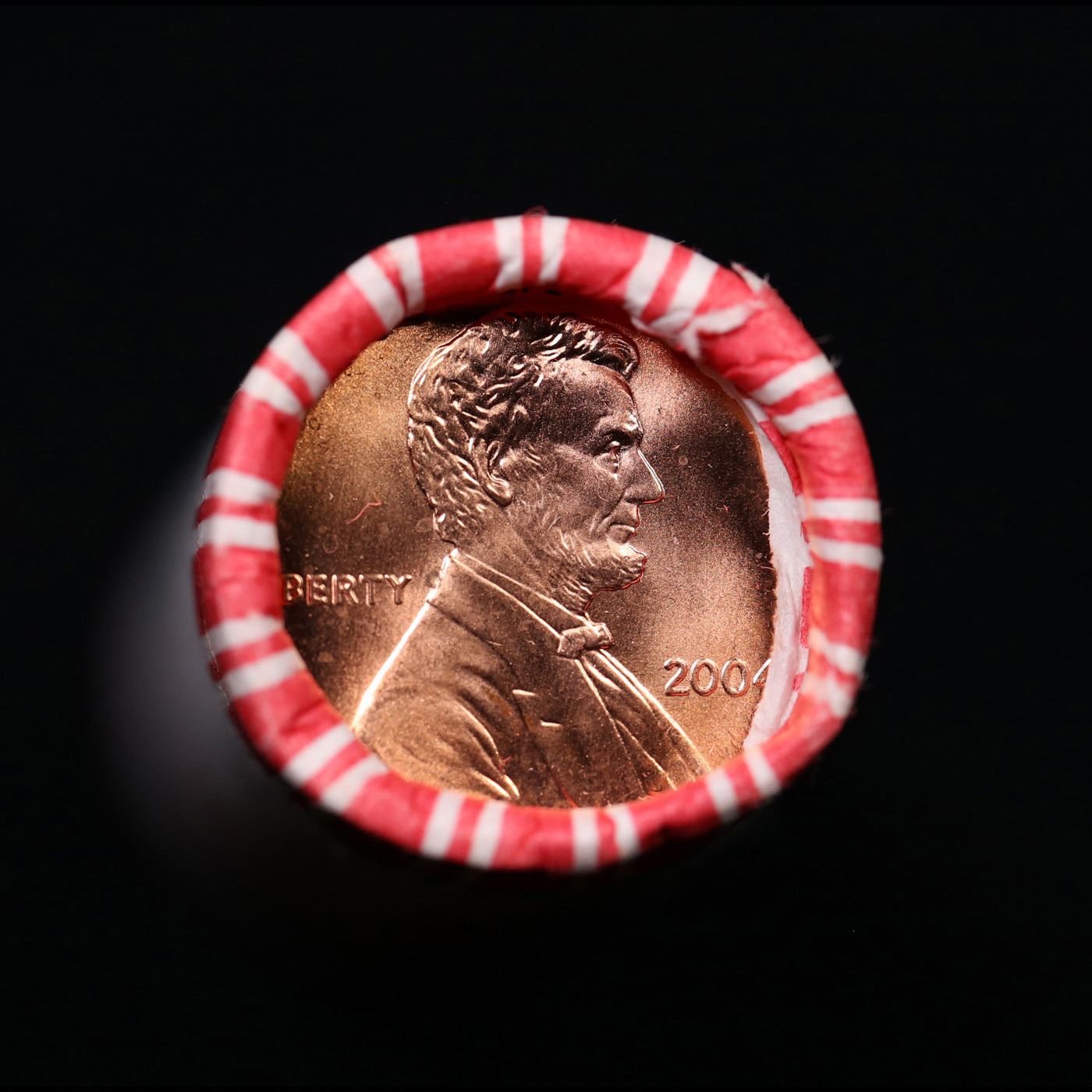 Shotgun Lincoln 1c roll, 2004-p 50 pcs N.F String & Son Wrapper.. A terrific Shotgun roll of Lincoln cents. Most if not all coin should be cherry red. Trends ms65 rd $10
