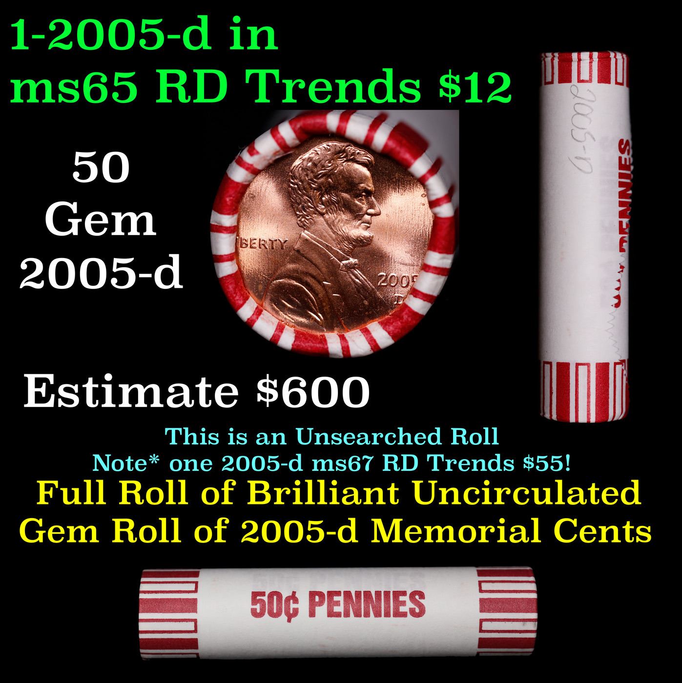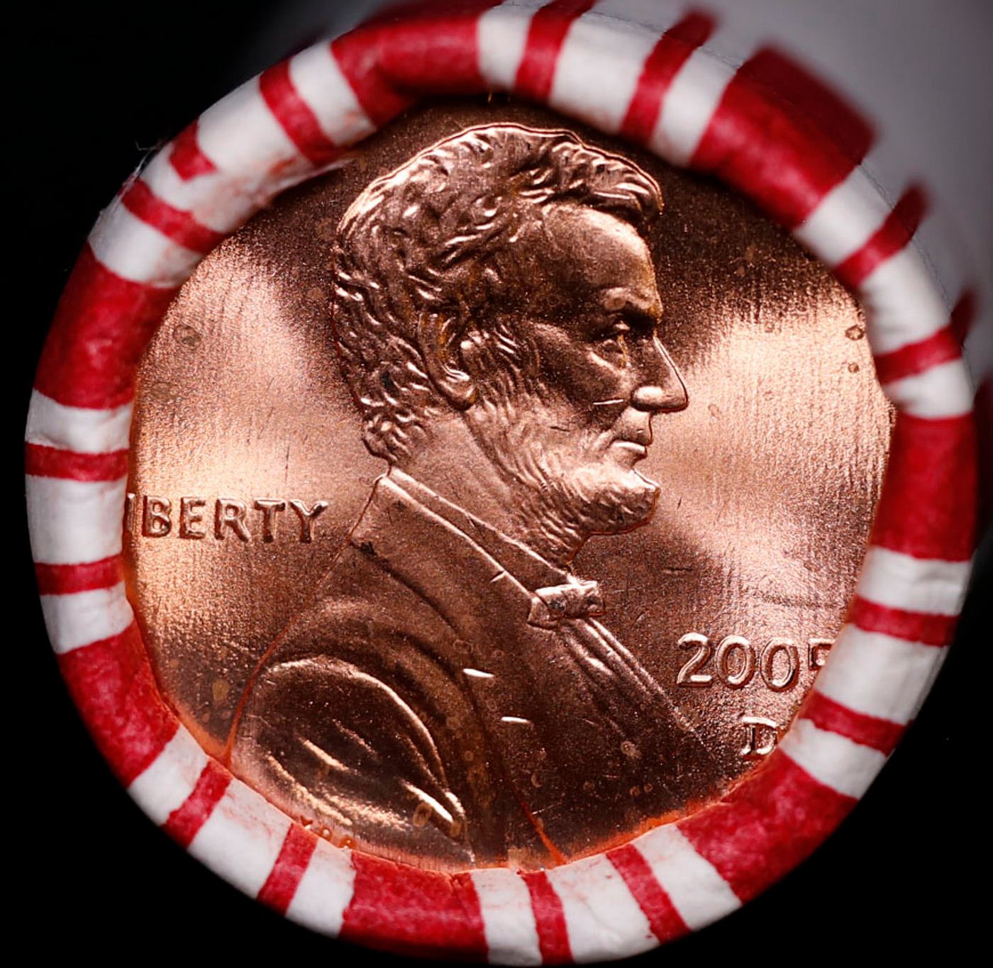 Shotgun Lincoln 1c roll, 2005-d 50 pcs Brandt 50c Wrapper.. A terrific Shotgun roll of Lincoln cents. Most if not all coin should be cherry red.