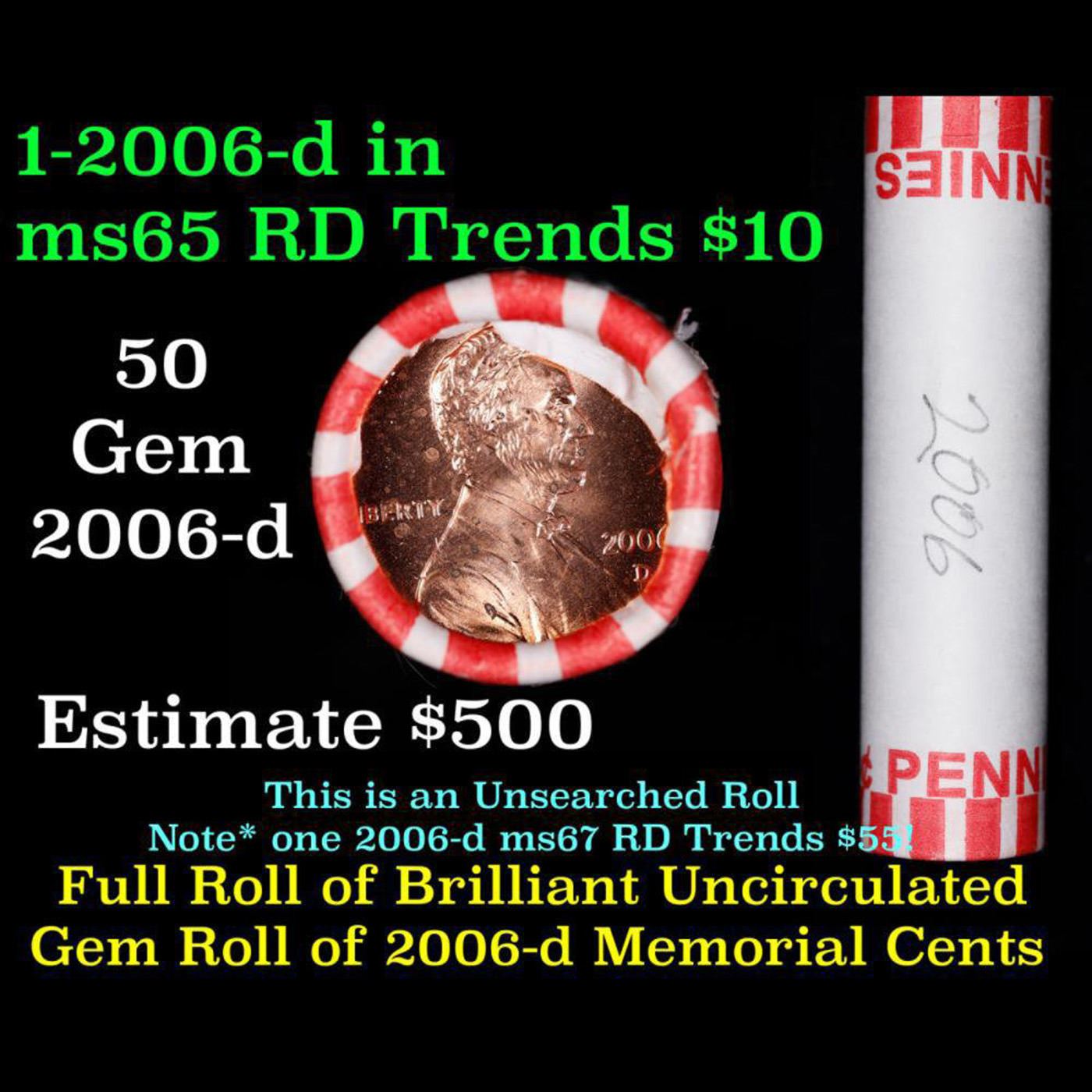 Shotgun Lincoln 1c roll, 2006-d 50 pcs Bank Wrapper.. A terrific Shotgun roll of Lincoln cents. Most if not all coin should be cherry red.