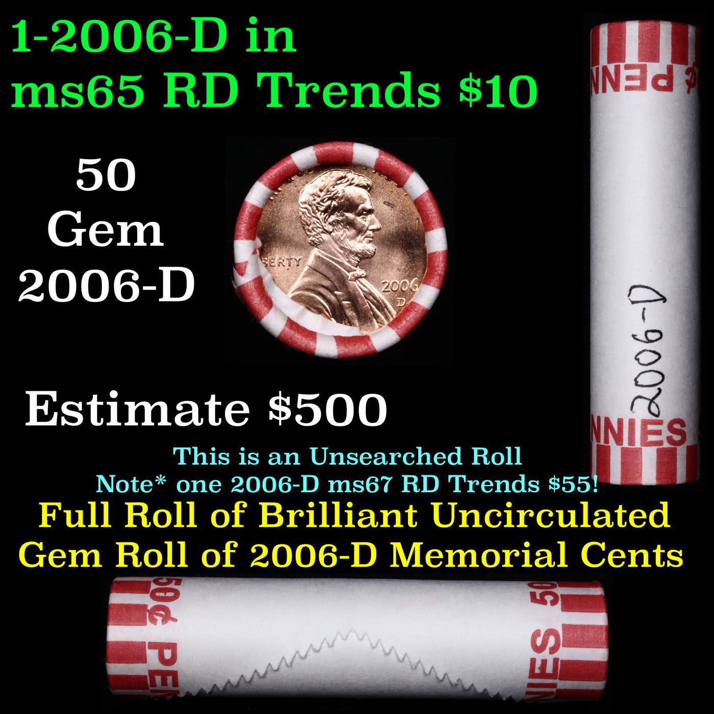 Shotgun Lincoln 1c roll, 2006-d 50 pcs Wrapper . A terrific Shotgun roll of Lincoln cents. All coins cherry red. Trends ms65 rd $10