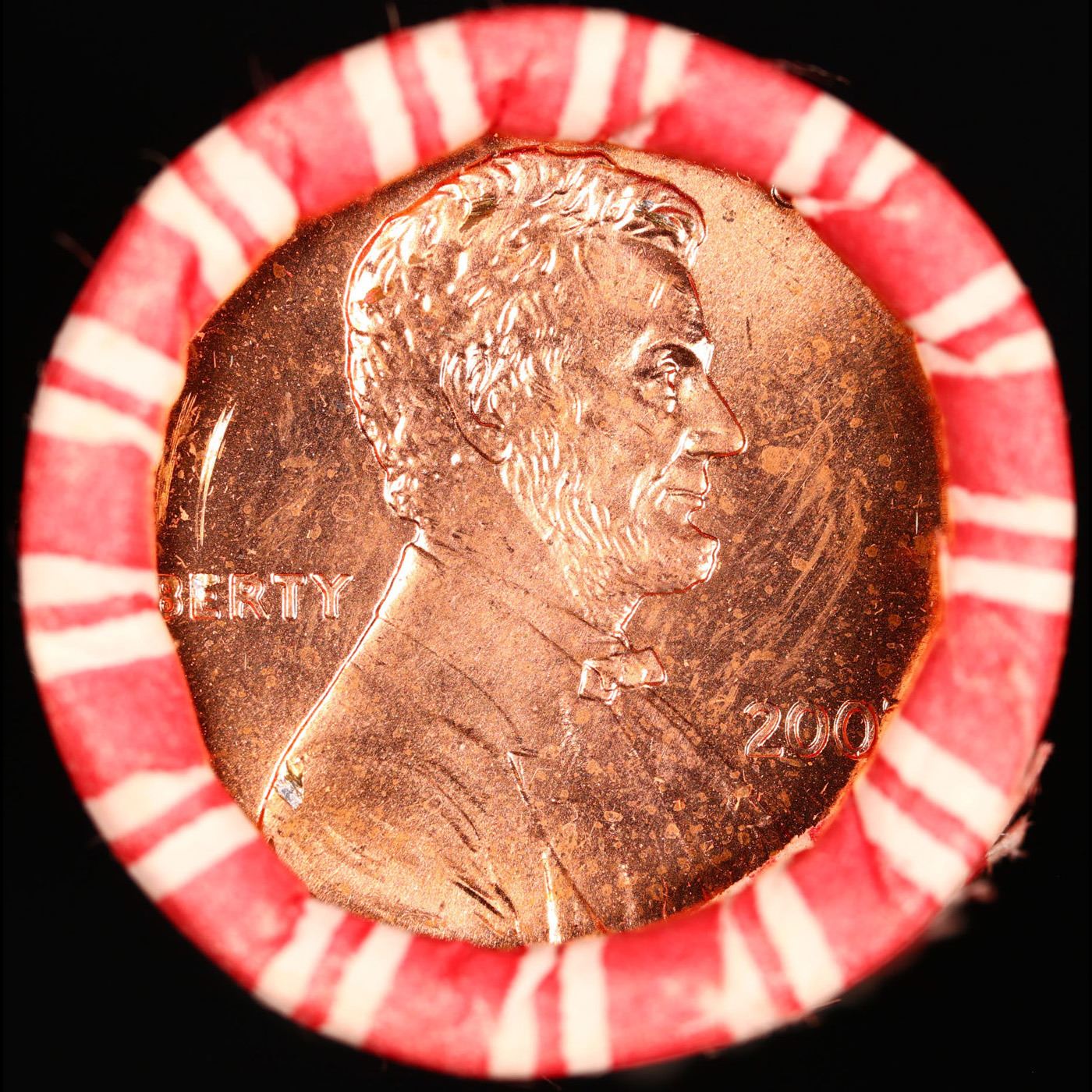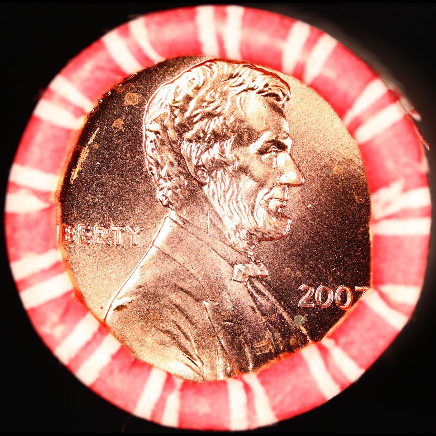 Shotgun Lincoln 1c roll, 2007-p 50, N.F String & Son Wrapper. A terrific Shotgun roll of Lincoln cents. All coins cherry red. Trends ms65 rd $10