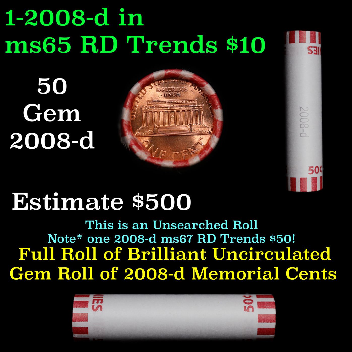 Shotgun Lincoln 1c roll, 2008-d 50 pcs Bank Wrapper.. A terrific Shotgun roll of Lincoln cents. Most if not all coin should be cherry red.
