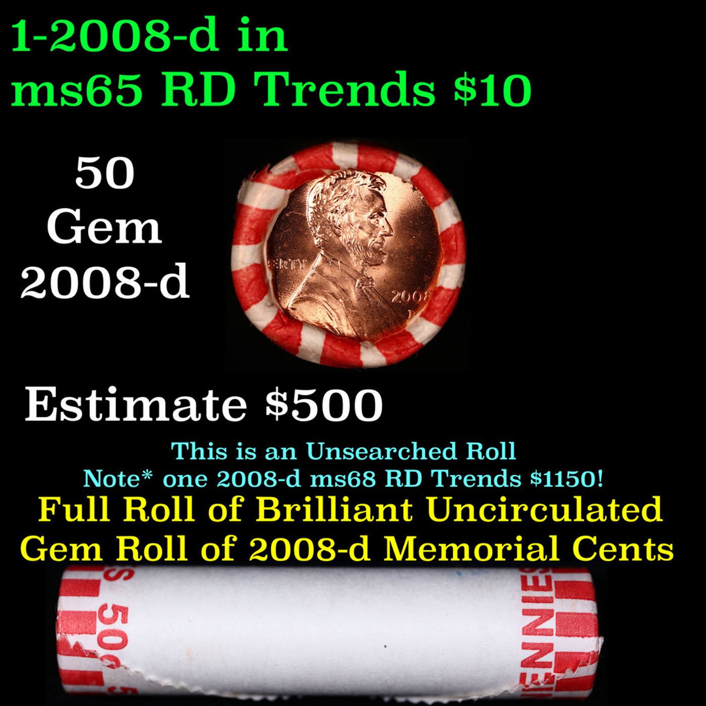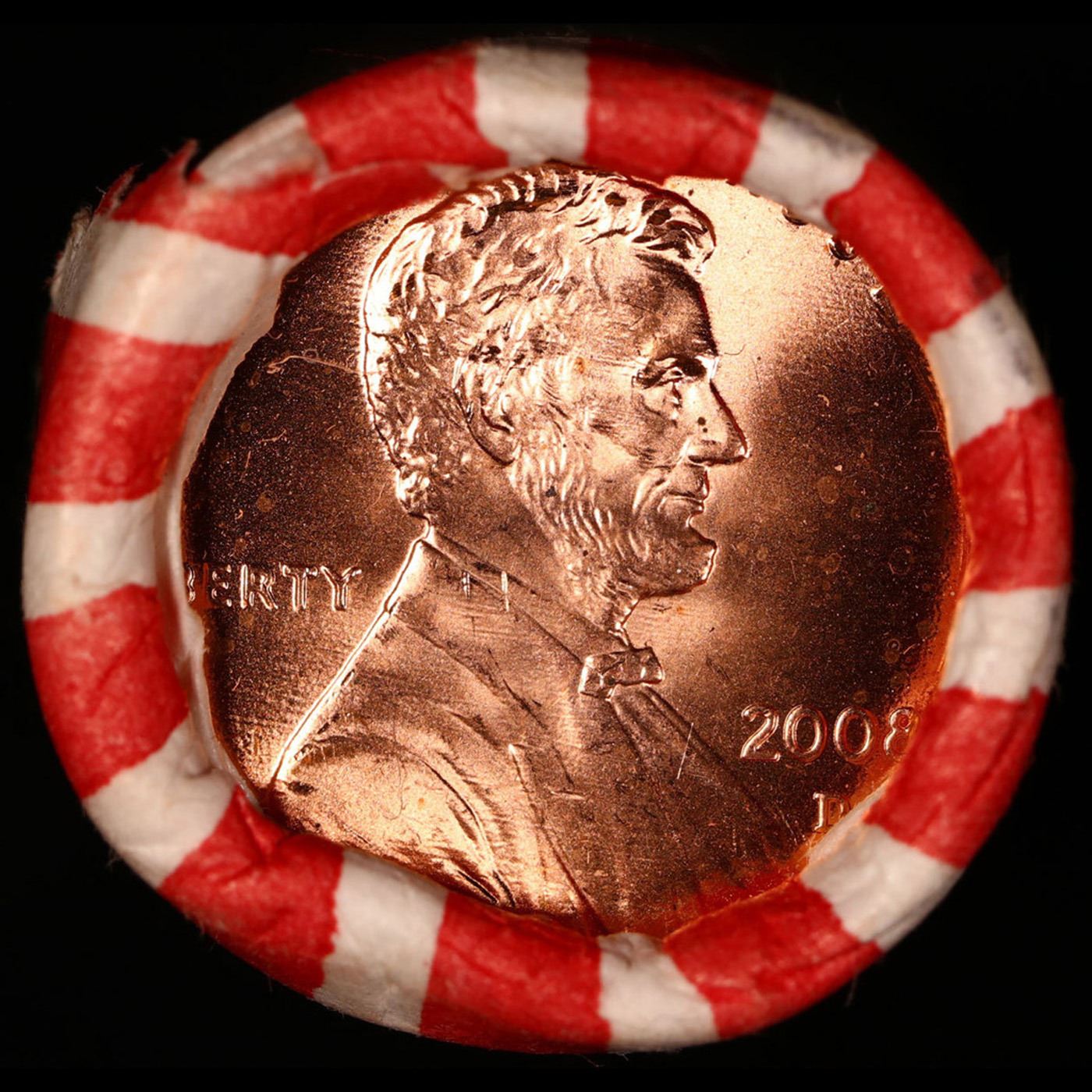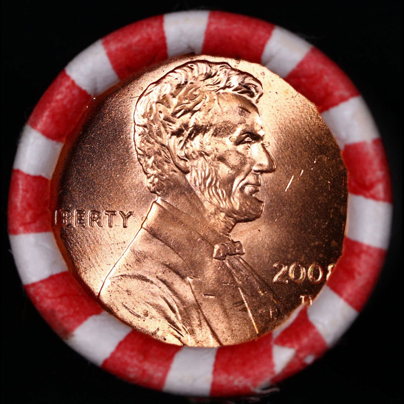 Shotgun Lincoln 1c roll, 2008-d 50 pcs N.F String & Son Wrapper . A terrific Shotgun roll of Lincoln cents. All coins cherry red. Trends ms65 rd $8