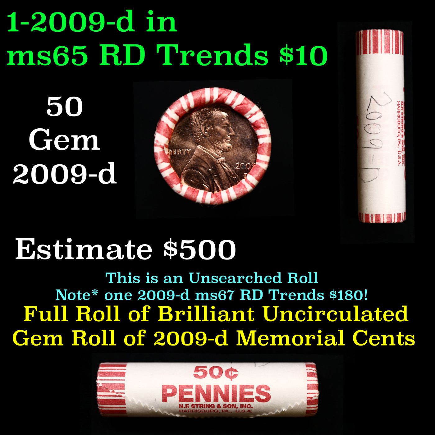 Shotgun Lincoln 1c roll, 2009-d 50 pcs N.F. String & Son Wrapper . A terrific Shotgun roll of Lincoln cents. All coins cherry red. Trends ms65 rd $16