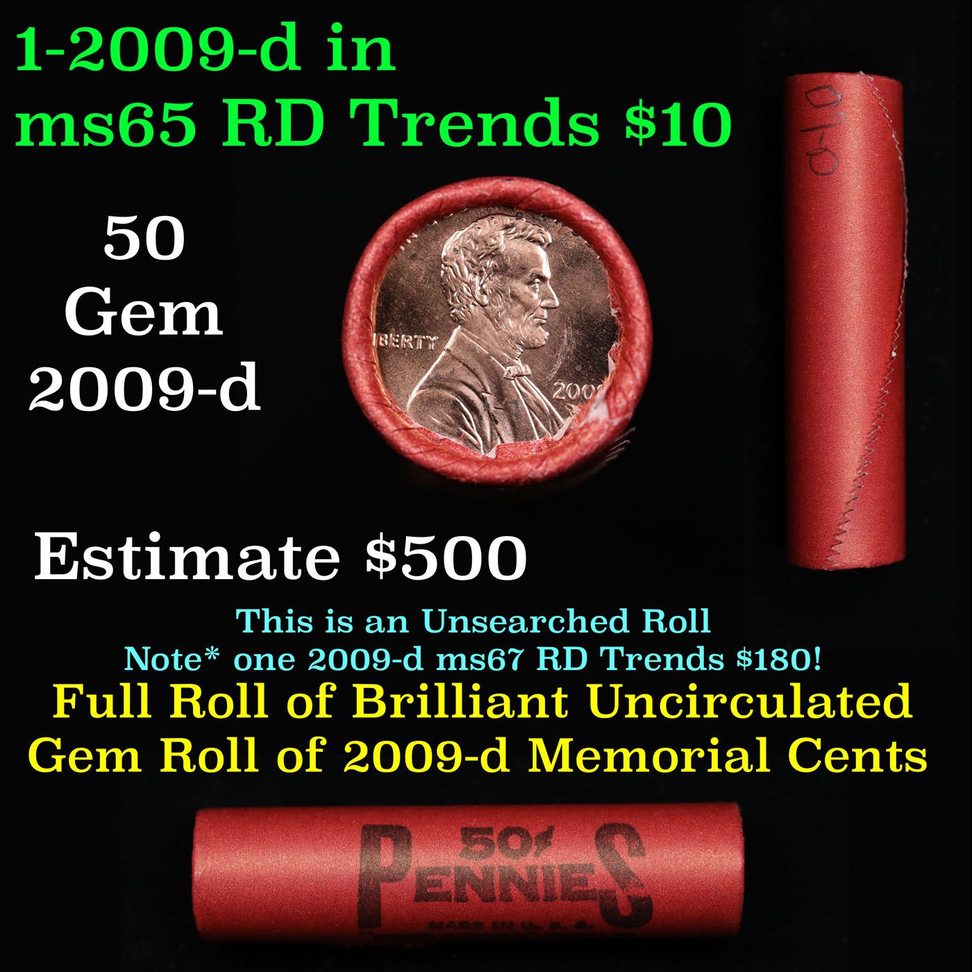 Shotgun Lincoln 1c roll, 2009-d Formative Years 50 pcs Bank Wrapper.. A terrific Shotgun roll of Lincoln cents. Most if not all coin should be cherry red.