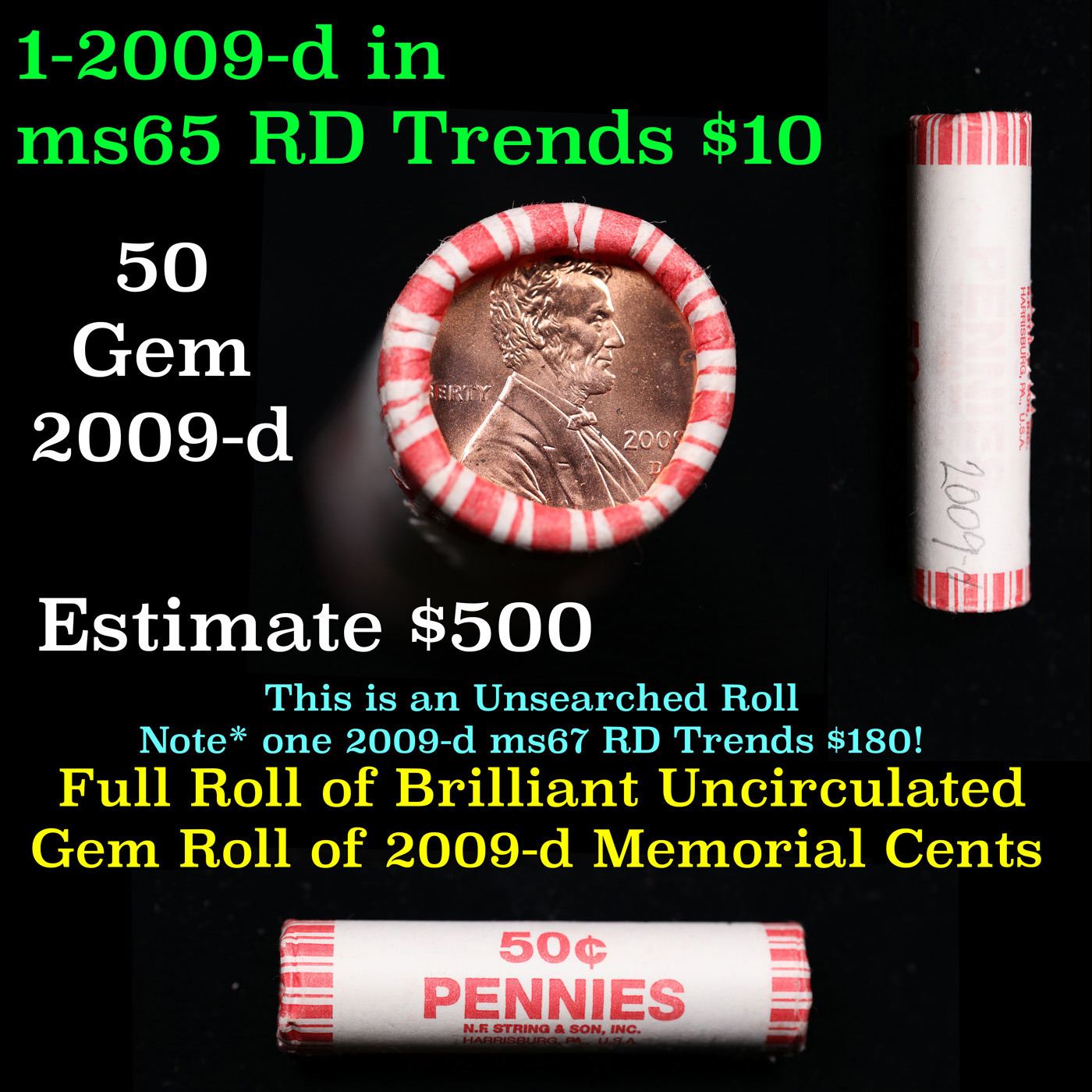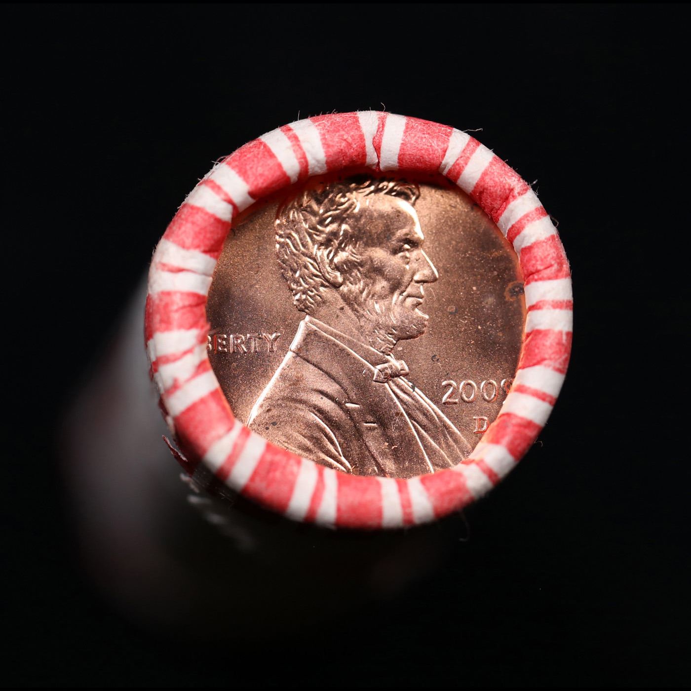 Shotgun Lincoln 1c roll, 2009-d Lincoln-Formative Years Bi-centennial 50 pcs N.F String & Son Wrapper.. A terrific Shotgun roll of Lincoln cents. Most if not all coin should be cherry red. Trends ms65 rd $10