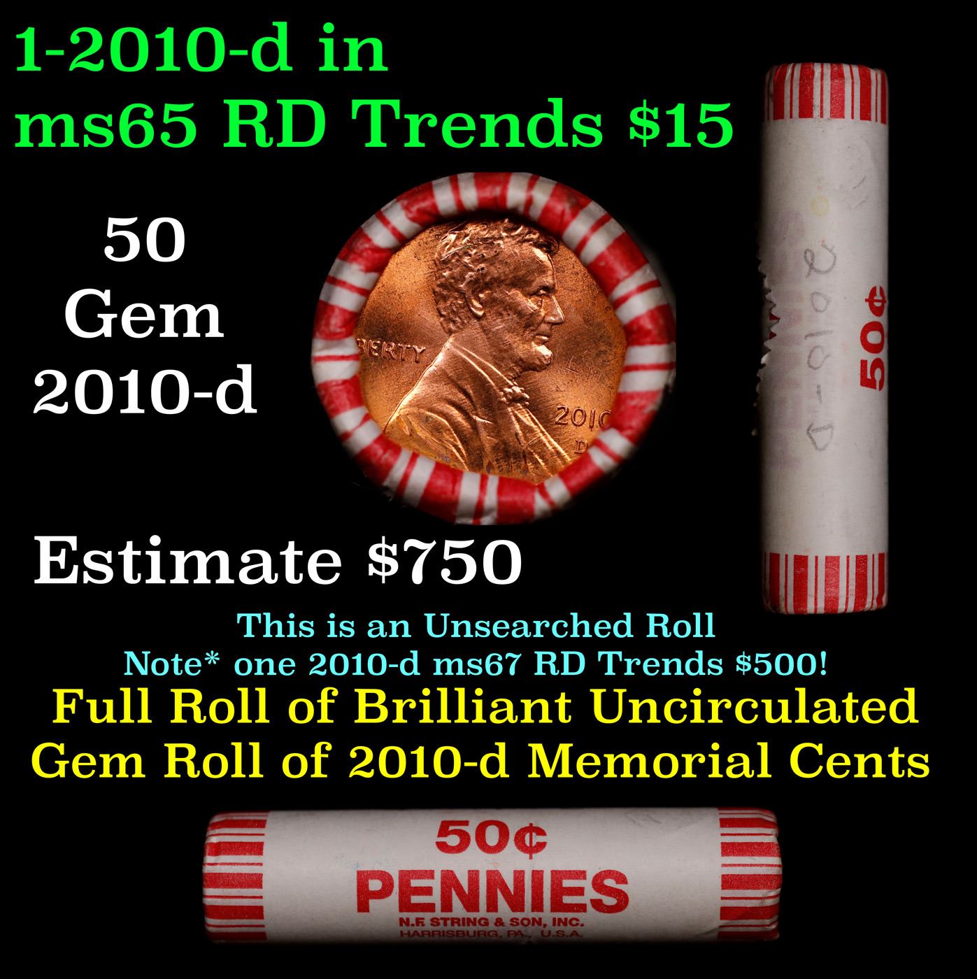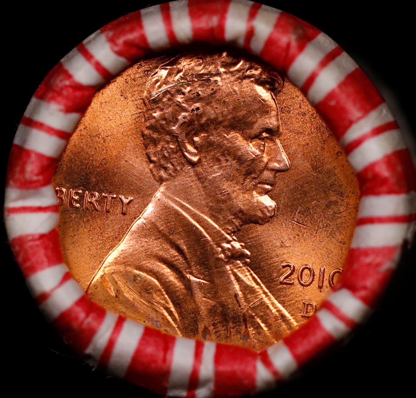 Shotgun Lincoln 1c roll, 2010-d 50 pcs Brandt 50c Wrapper.. A terrific Shotgun roll of Lincoln cents. Most if not all coin should be cherry red.