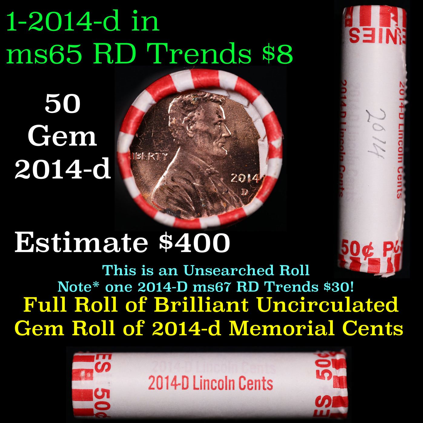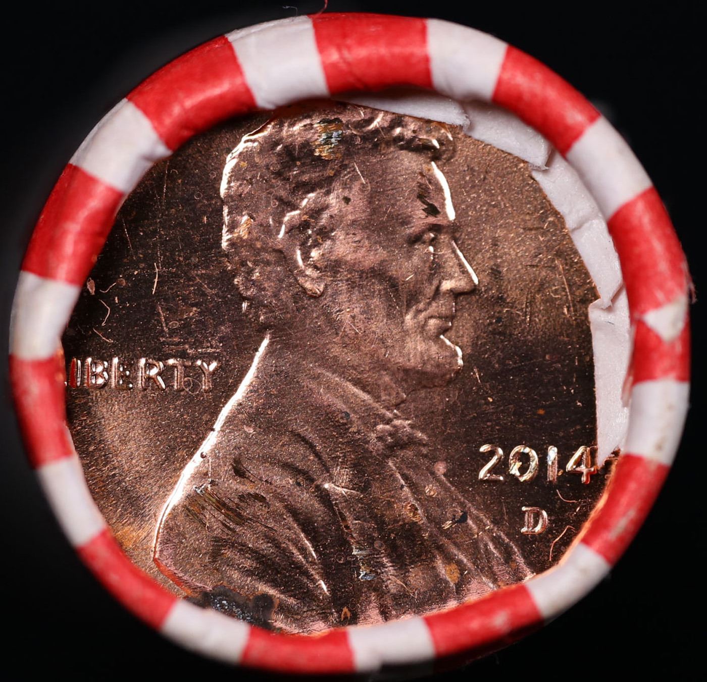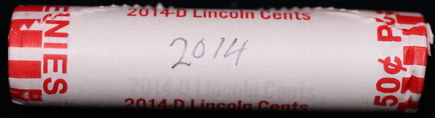 Shotgun Lincoln 1c roll, 2014-d 50 pcs Brandt Wrapper . A terrific Shotgun roll of Lincoln cents. All coins cherry red. Trends ms65 rd $8