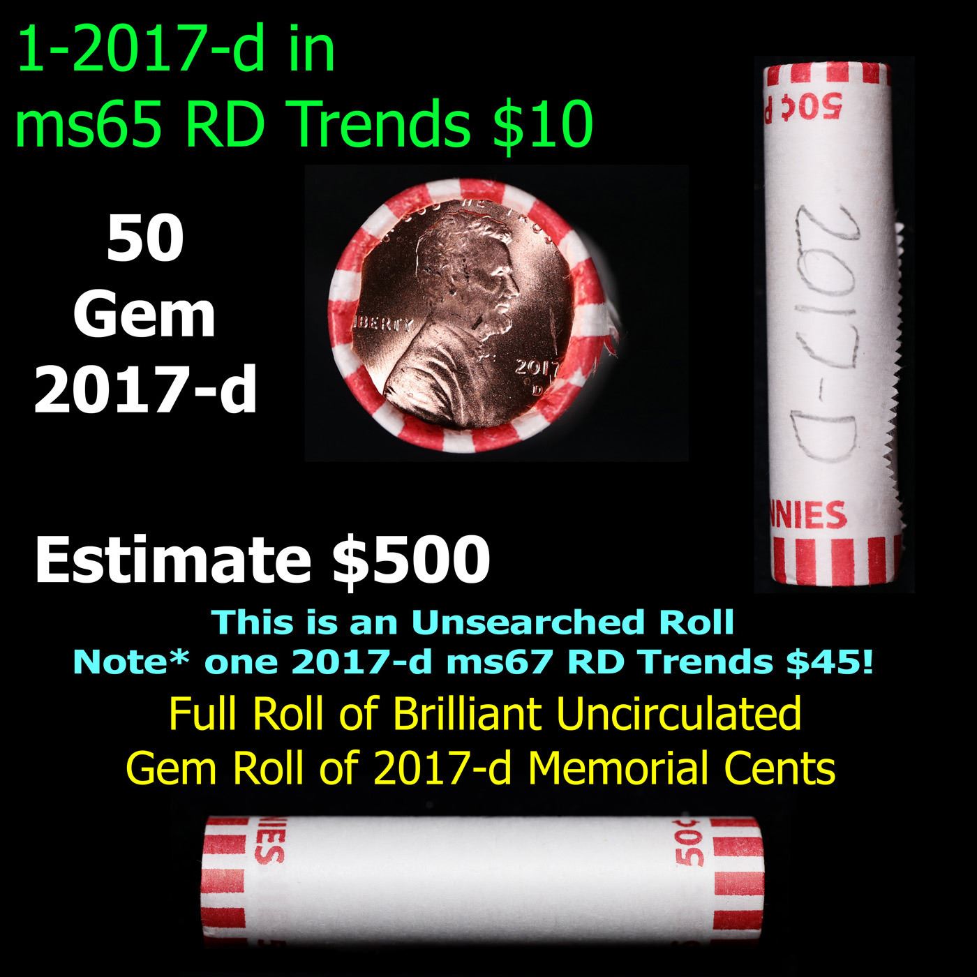 Shotgun Lincoln 1c roll, 2017-d 50 pcs Bank Wrapper.. A terrific Shotgun roll of Lincoln cents. Most if not all coin should be cherry red.