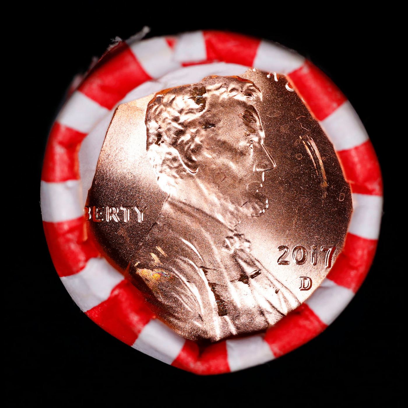 Shotgun Lincoln 1c roll, 2017-d 50 pcs Bank Wrapper.. A terrific Shotgun roll of Lincoln cents. Most if not all coin should be cherry red.