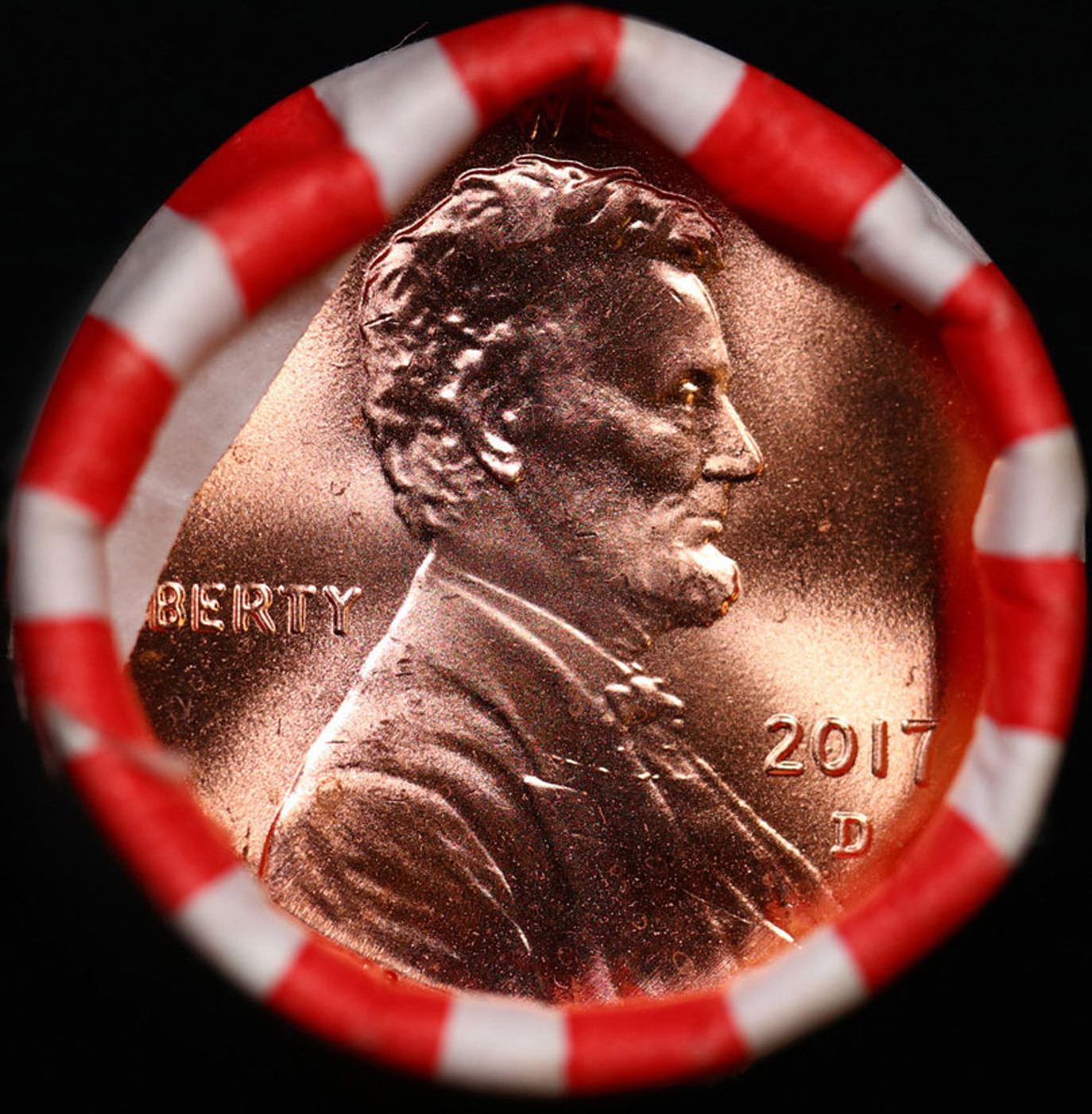 Shotgun Lincoln 1c roll, 2017-d 50 pcs Bank Wrapper.. A terrific Shotgun roll of Lincoln cents. Most if not all coin should be cherry red.