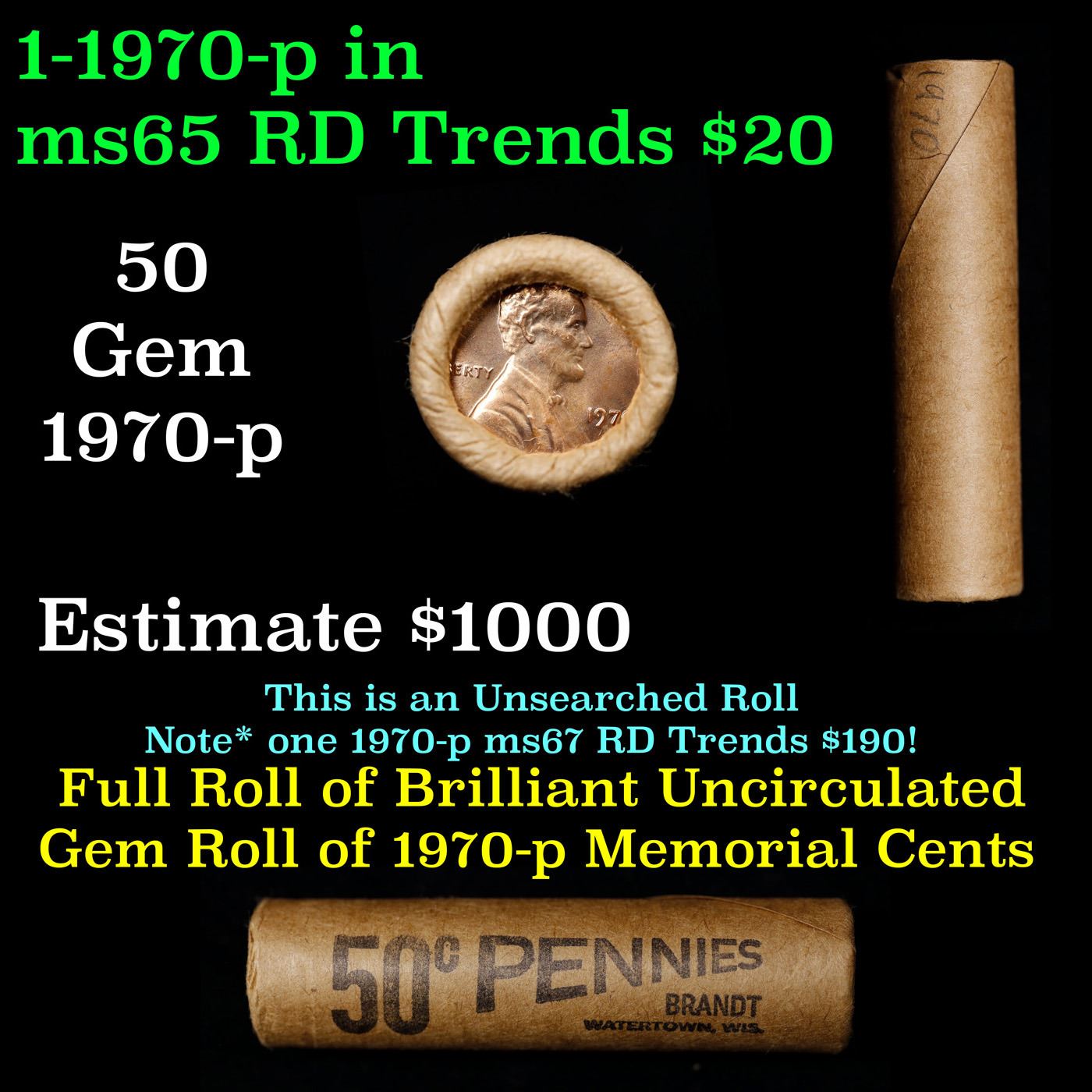 Shotgun Lincoln 1c roll, Brandt Wrapper 1970-p 50 pcs . A terrific Shotgun roll of Lincoln cents. All coins appear to be cherry red. Trends ms65 rd $18