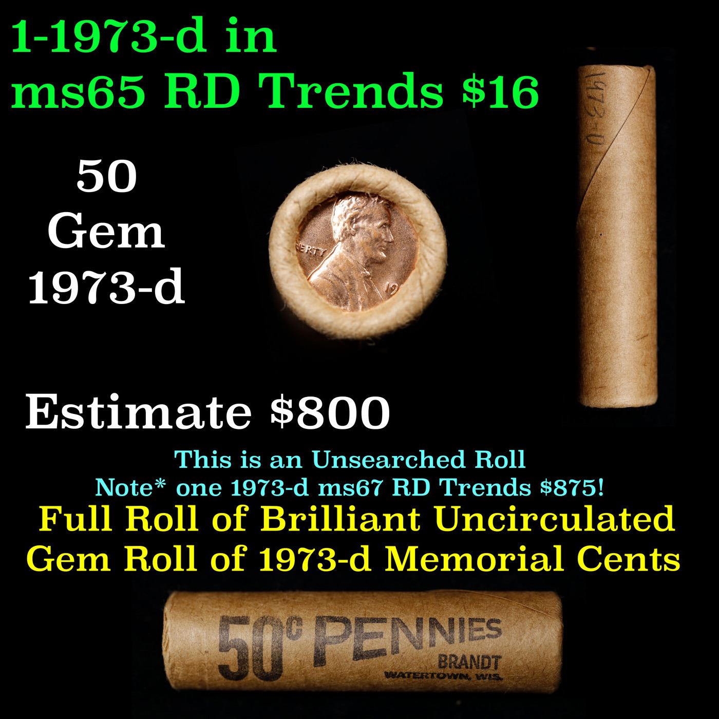 Shotgun Lincoln 1c roll, Brandt Wrapper 1973-d 50 pcs . A terrific Shotgun roll of Lincoln cents. All coins appear to be cherry red. Trends ms65 rd $16