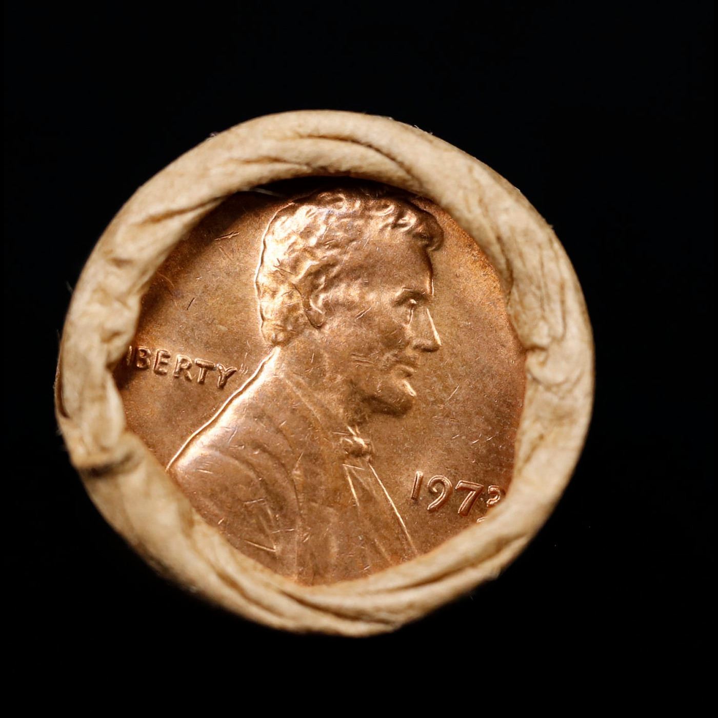 Shotgun Lincoln 1c roll, Brandt Wrapper 1973-p 50 pcs . A terrific Shotgun roll of Lincoln cents. All coins appear to be cherry red. Trends ms65 rd $14