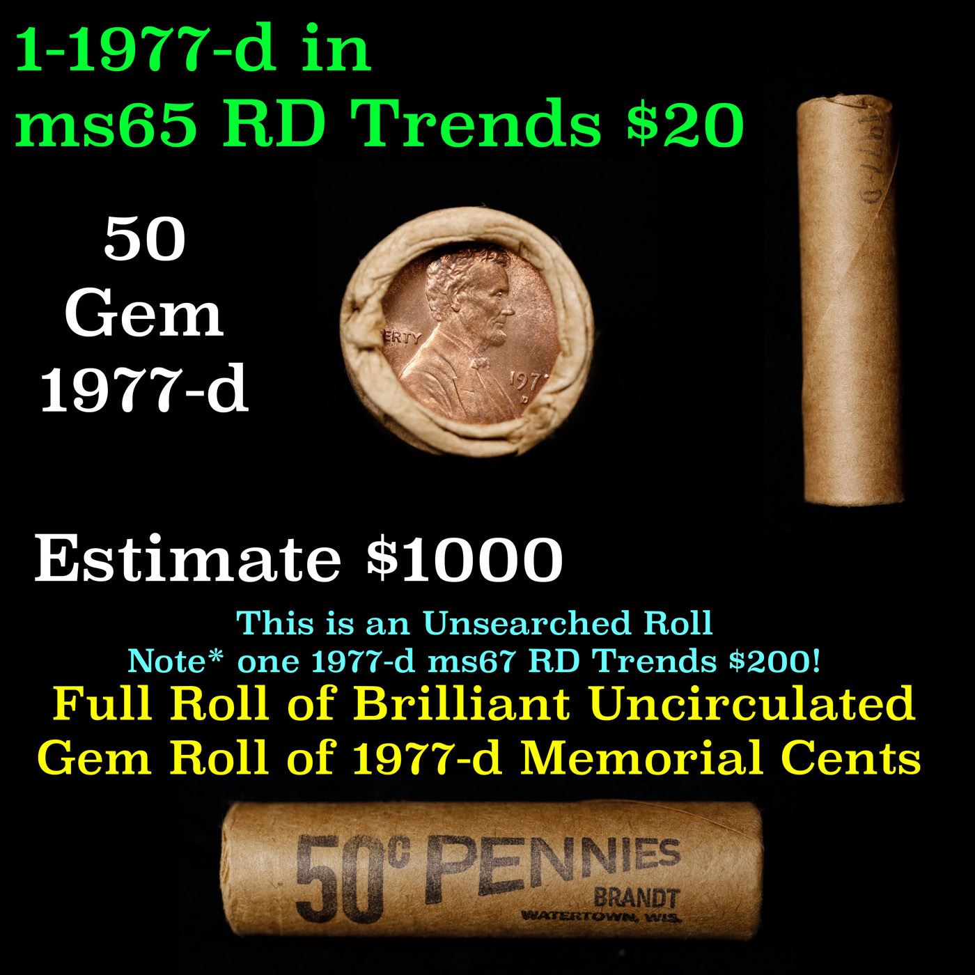 Shotgun Lincoln 1c roll, Brandt Wrapper 1977-d 50 pcs . A terrific Shotgun roll of Lincoln cents. All coins appear to be cherry red. Trends ms65 rd $20