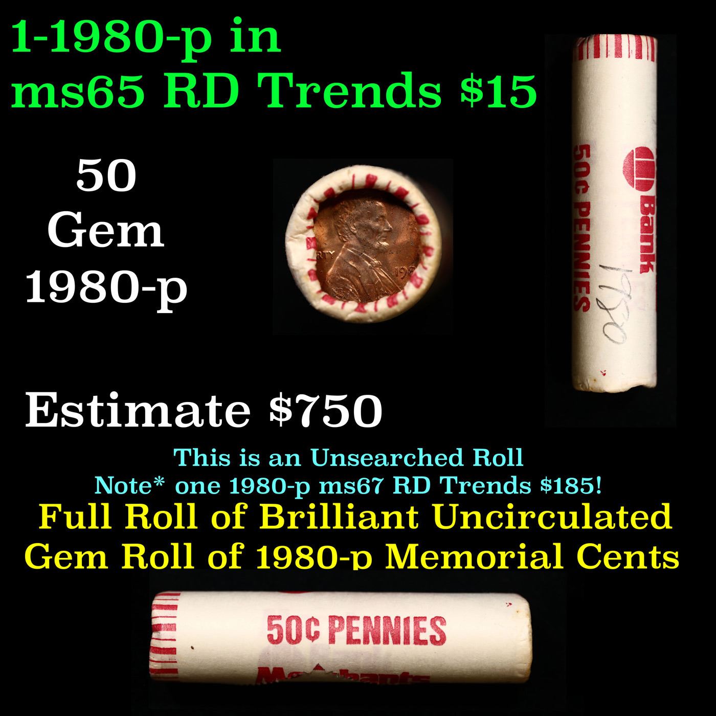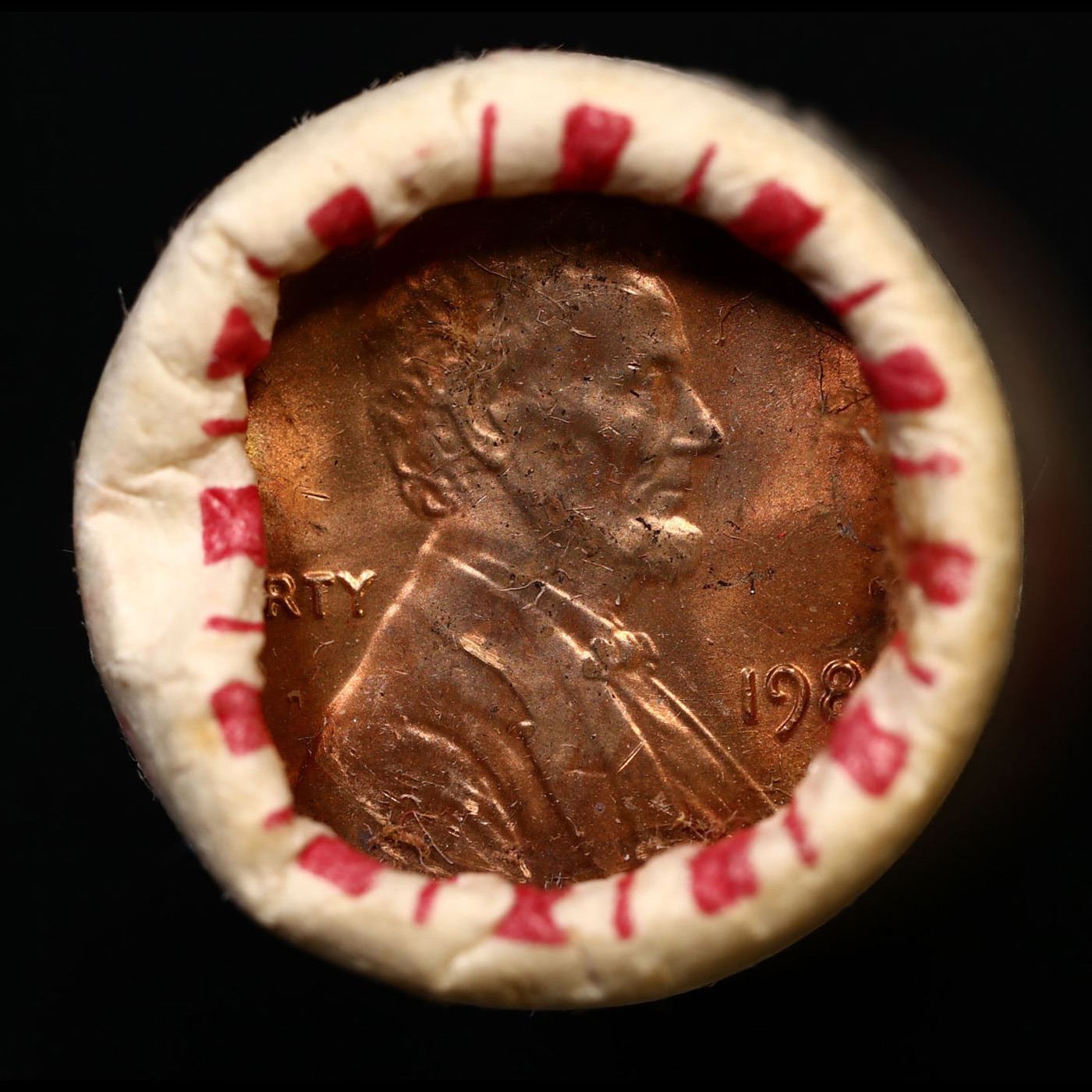 Shotgun Lincoln 1c roll,Merchants Bank Wrapper 1980-p 50 pcs. A terrific Shotgun roll of Lincoln cents. All coins cherry red. Trends ms65 rd $14