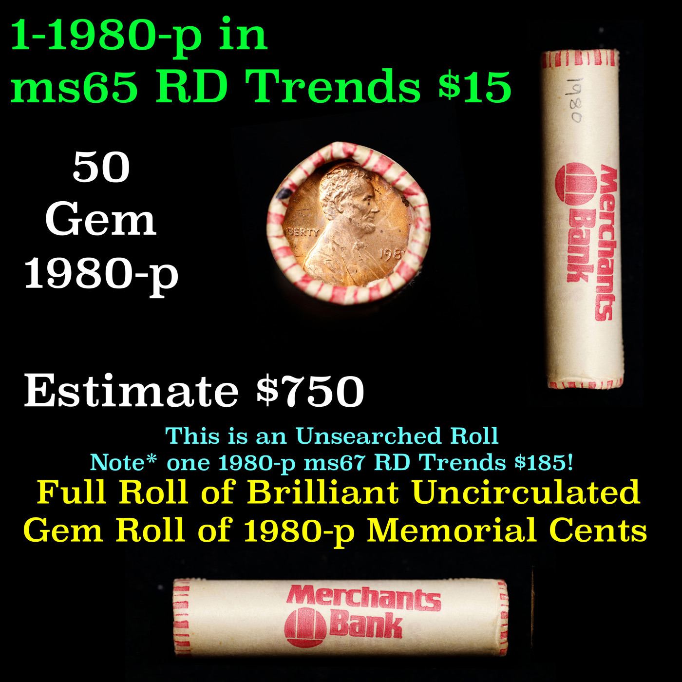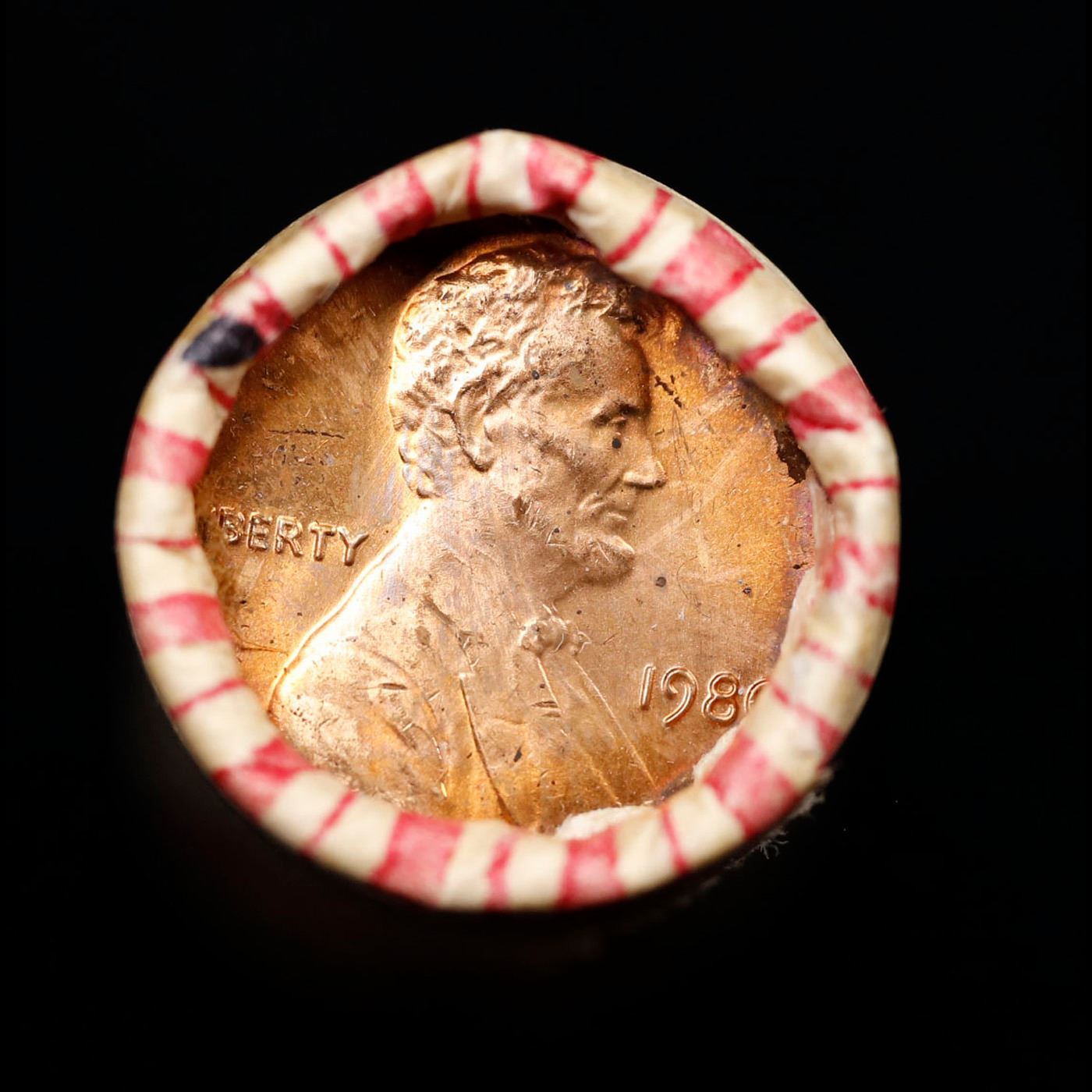 Shotgun Lincoln 1c roll,Merchants Bank Wrapper 1980-p 50 pcs. A terrific Shotgun roll of Lincoln cents. All coins cherry red. Trends ms65 rd $14