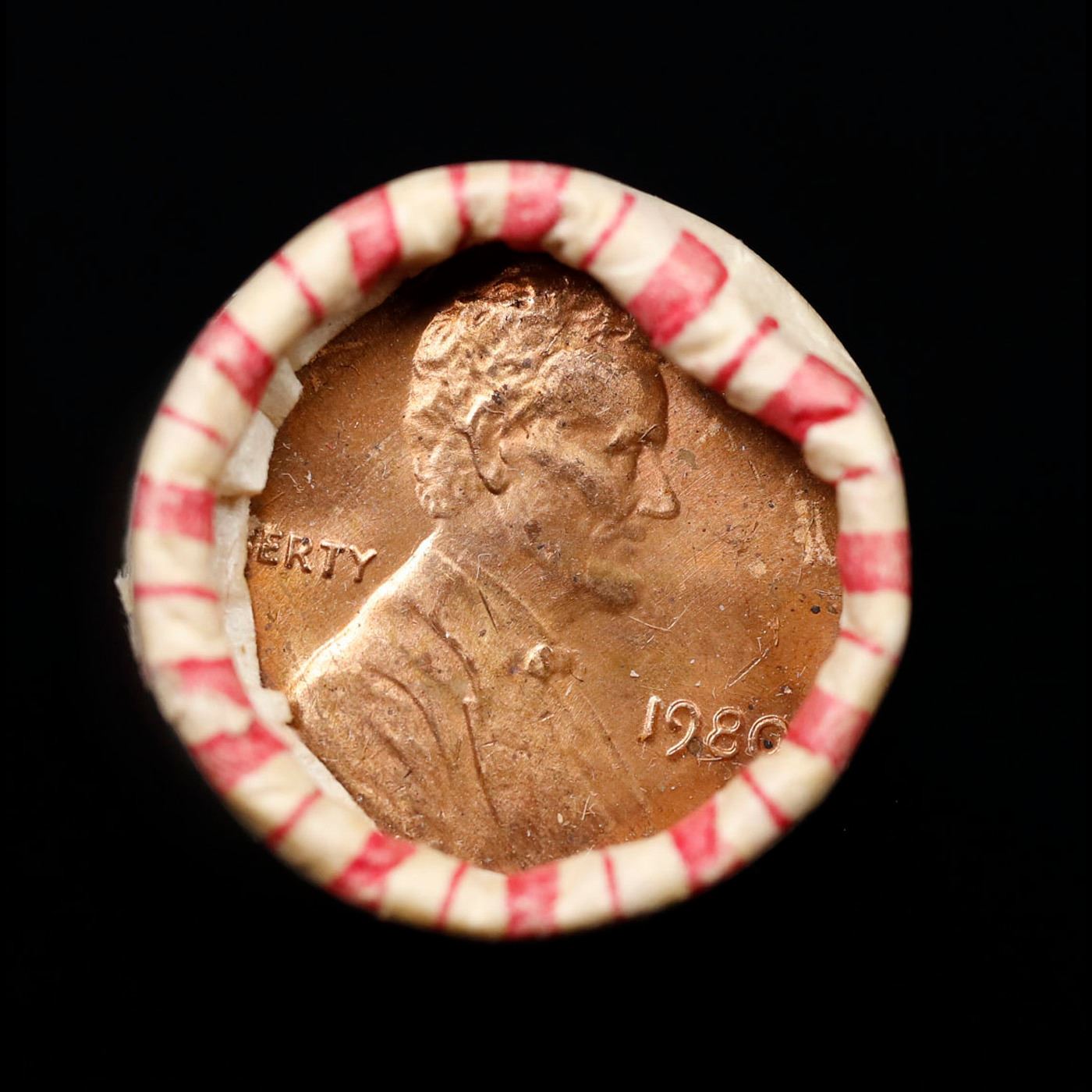 Shotgun Lincoln 1c roll,Merchants Bank Wrapper 1980-p 50 pcs. A terrific Shotgun roll of Lincoln cents. All coins cherry red. Trends ms65 rd $14