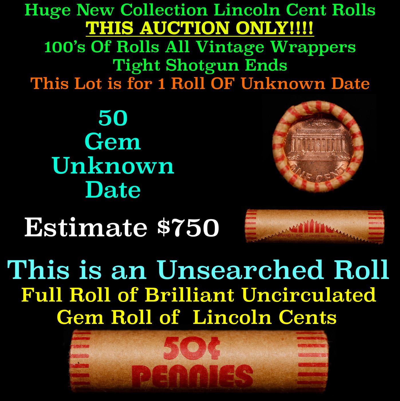 Shotgun Lincoln 1c roll, Unknown Date 50 pcs Brandt Wrapper.. A terrific Shotgun roll of Lincoln cents. Most if not all coin should be cherry red.