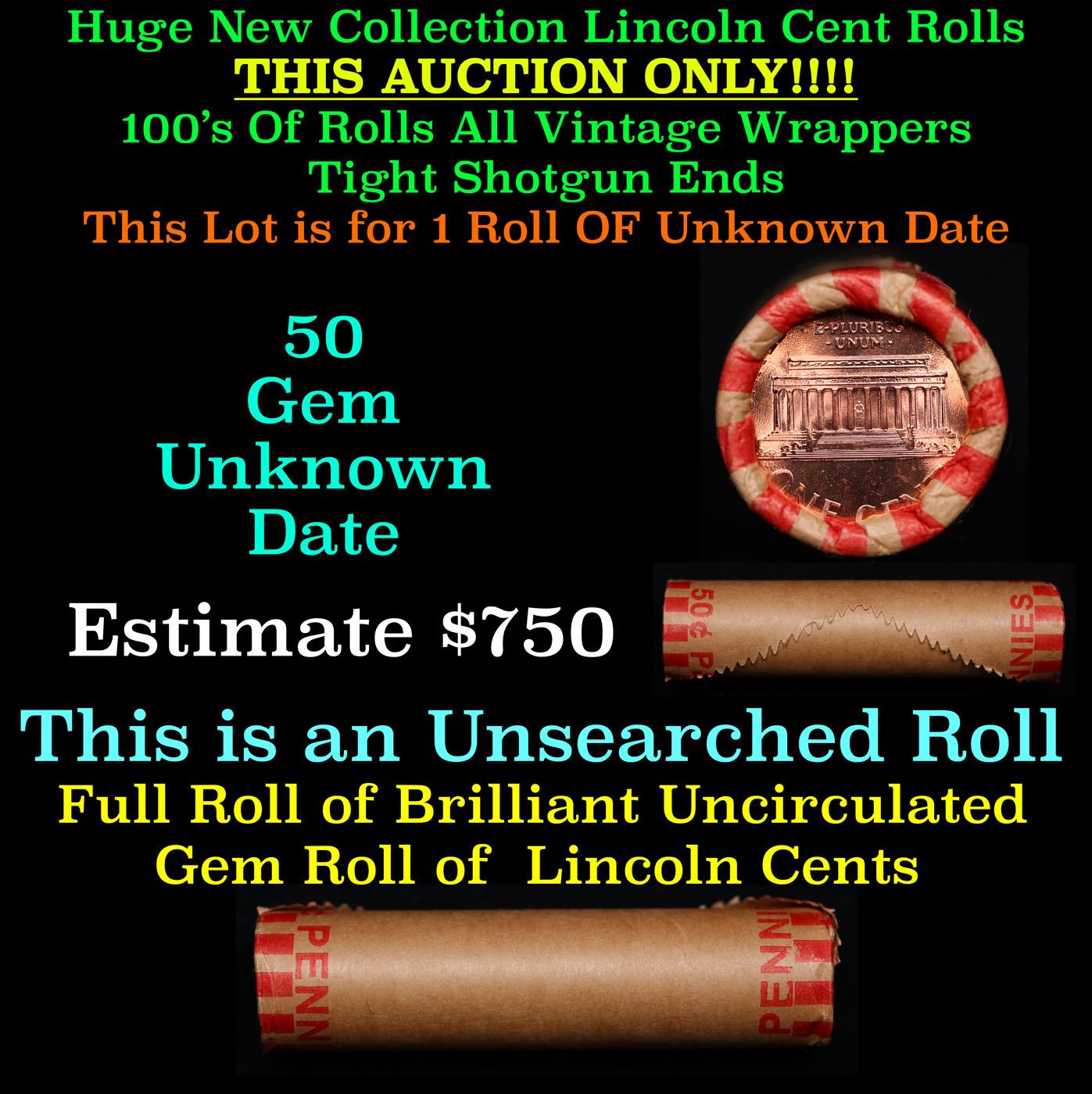 Shotgun Lincoln 1c roll, Unknown Date 50 pcs Vintage Bank Wrapper.. A terrific Shotgun roll of Lincoln cents. Most if not all coin should be cherry red.