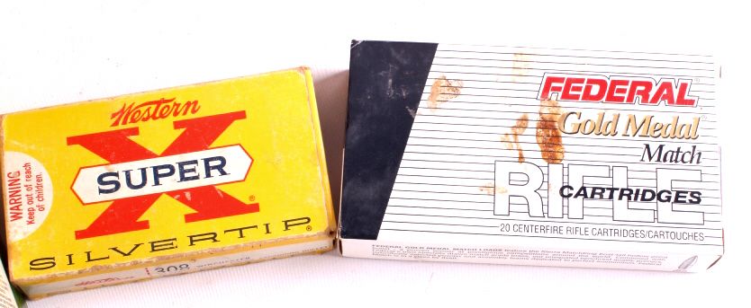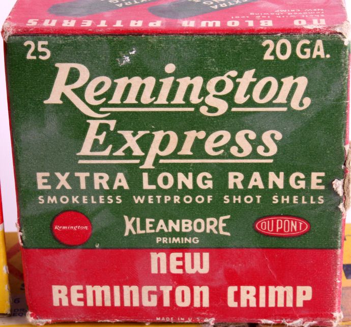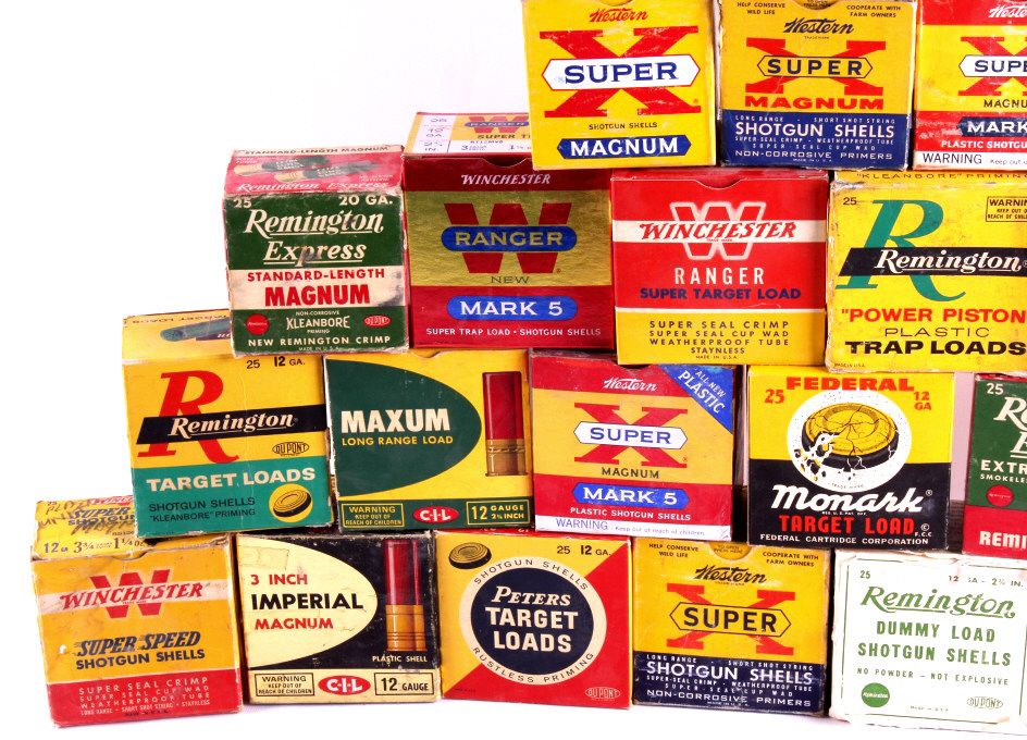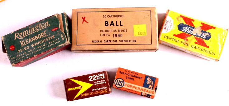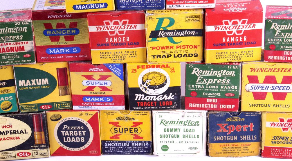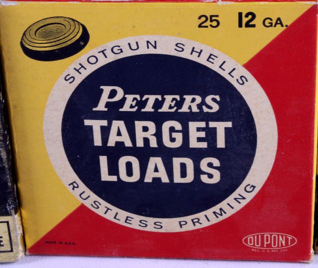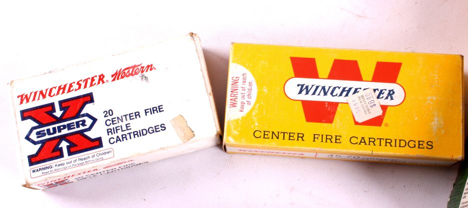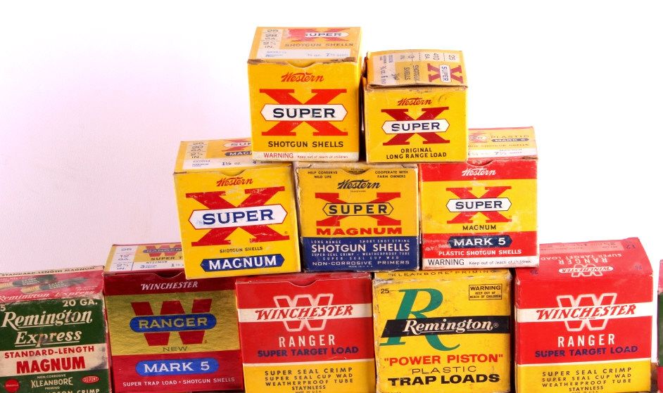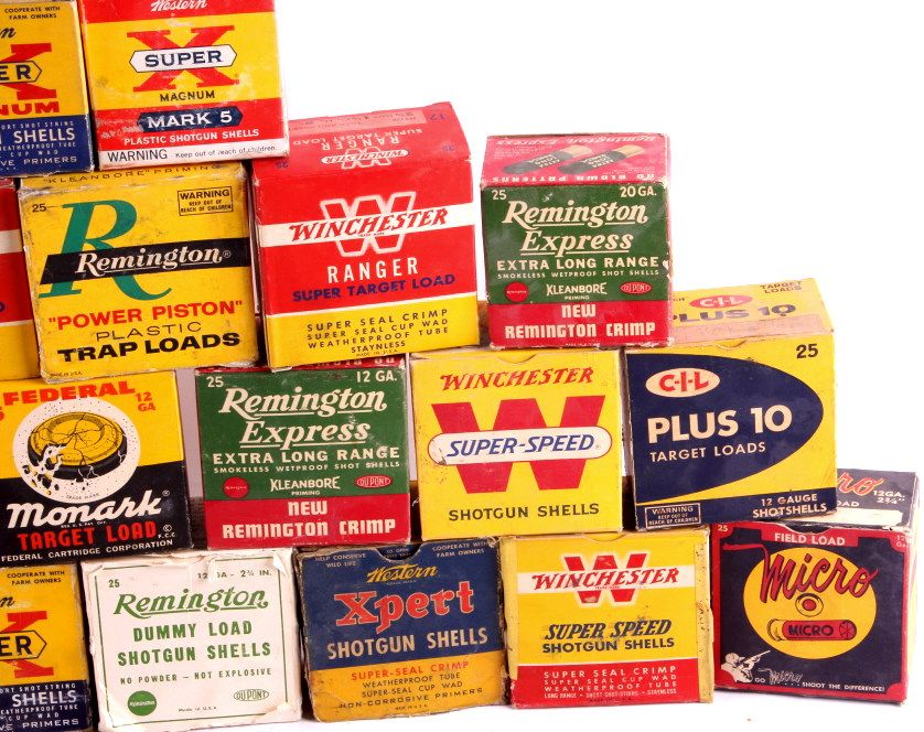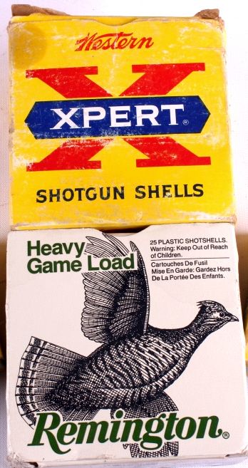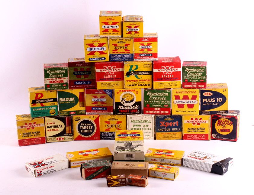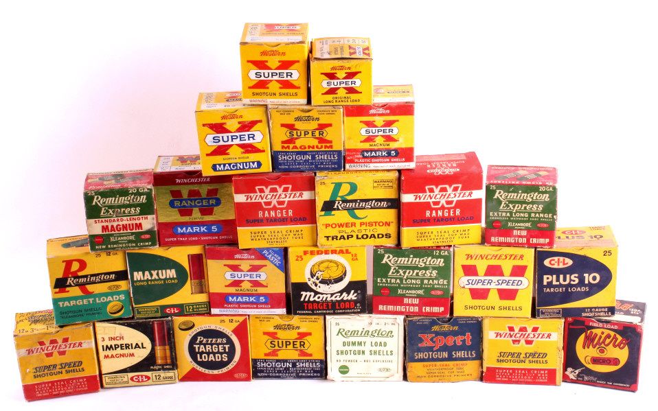 This is a collection of shotgun, rifle, and pistol ammunition boxes. 2 boxes are full with unfired ammunition. They are the Western Xpert 12 GA. 2 3/4" and the Remington Heavy Game Load 12 GA. 2 3/4". Each box contains 25 shotgun shells. There are 25 empty shotgun shell boxes from various manufacturers and cailbers. There are 8 empty rifle and pistol boxes from various manufacturers and calibers. The majority of the boxes are in good condition with a few that are in fair condition.