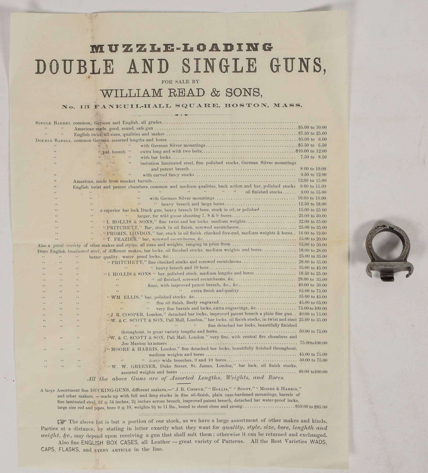 The broadsheet is advertisement for William Read & Sons of Boston, Massachusetts. This was printed during the muzzleloading shotgun period from the 1850-1860s. Their inventory was very extensive that includes British made guns as well. William Read and Sons were also suppliers of ammunition to the Union army during the Civil War. Light folding. Please see photo for details.
